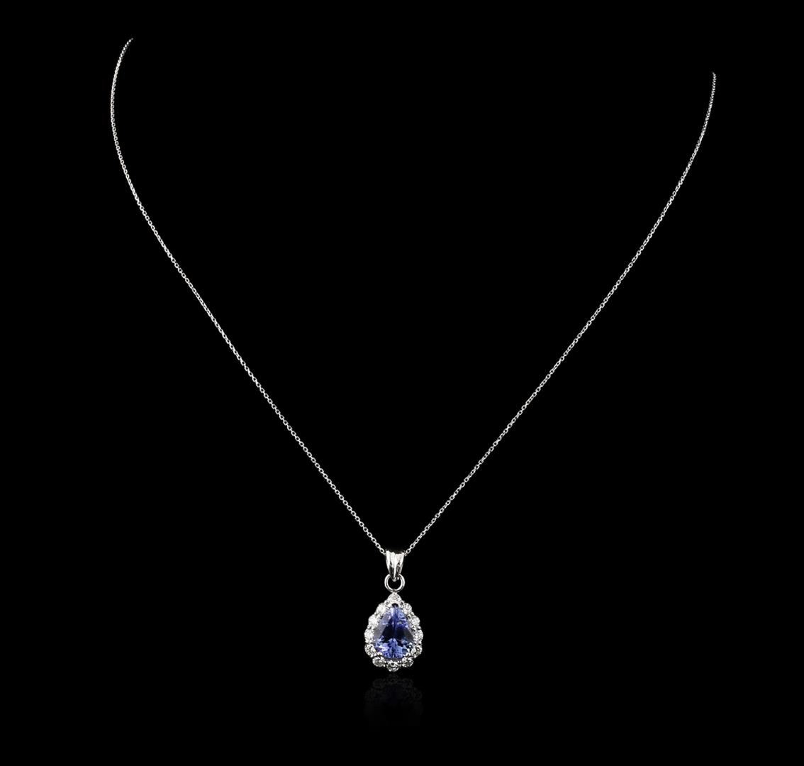 One electronically tested 14KT white gold ladies cast tanzanite and diamond pendant & chain 16.0" long, cable link with a spring ring clasp with a bright and brushed finish. Identified with markings of "14K". Condition is new. Containing: One prong set pear modified brilliant cut natural tanzanite, measuring 9.25 x 7.77 x 5.05mm, approximate weight of 2.43ct., clarity is eye clean, type I, medium, moderately strong, violet color, (GIA V 5/4), cut is good. Twelve prong set round brilliant cut diamonds, measuring 2.50 - 2.50 x 1.50mm (depth est.) approximate total weight of 12 Stones = 0.69ct. Clarity: SI-1 to SI-2. Color: I - J, Cut is Good. Colored gemstones are presumed to have been subjected to commonly used enhancement processes. All diamonds and colored gemstones are graded in the mounting, unless otherwise stated. Total Weight of Colored Stones 2.43ct. Total Weight of Diamonds 0.69ct. Total Weight of Pendant & Chain 3.80 grams. GGL Appraised at $3,590.00.