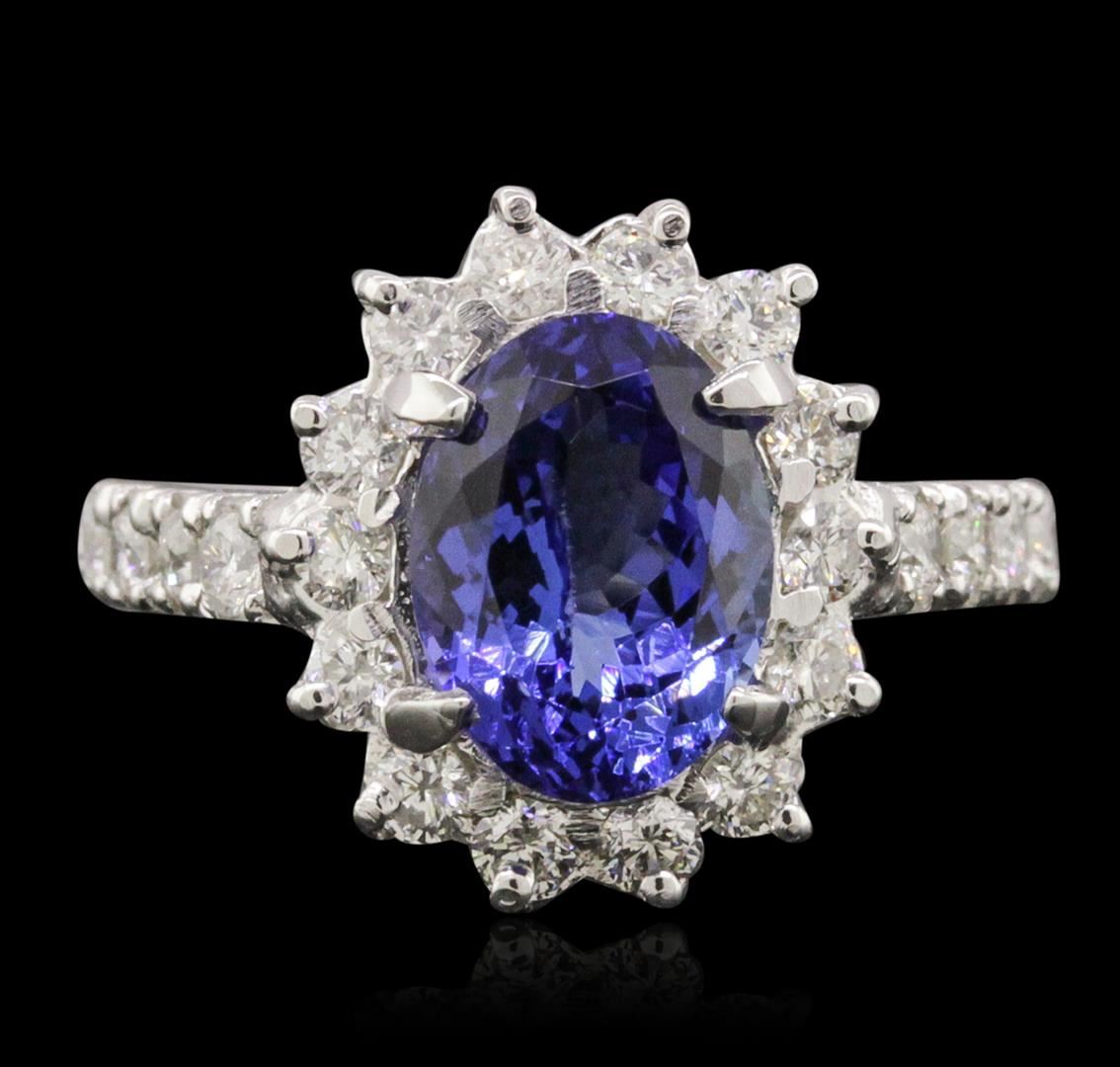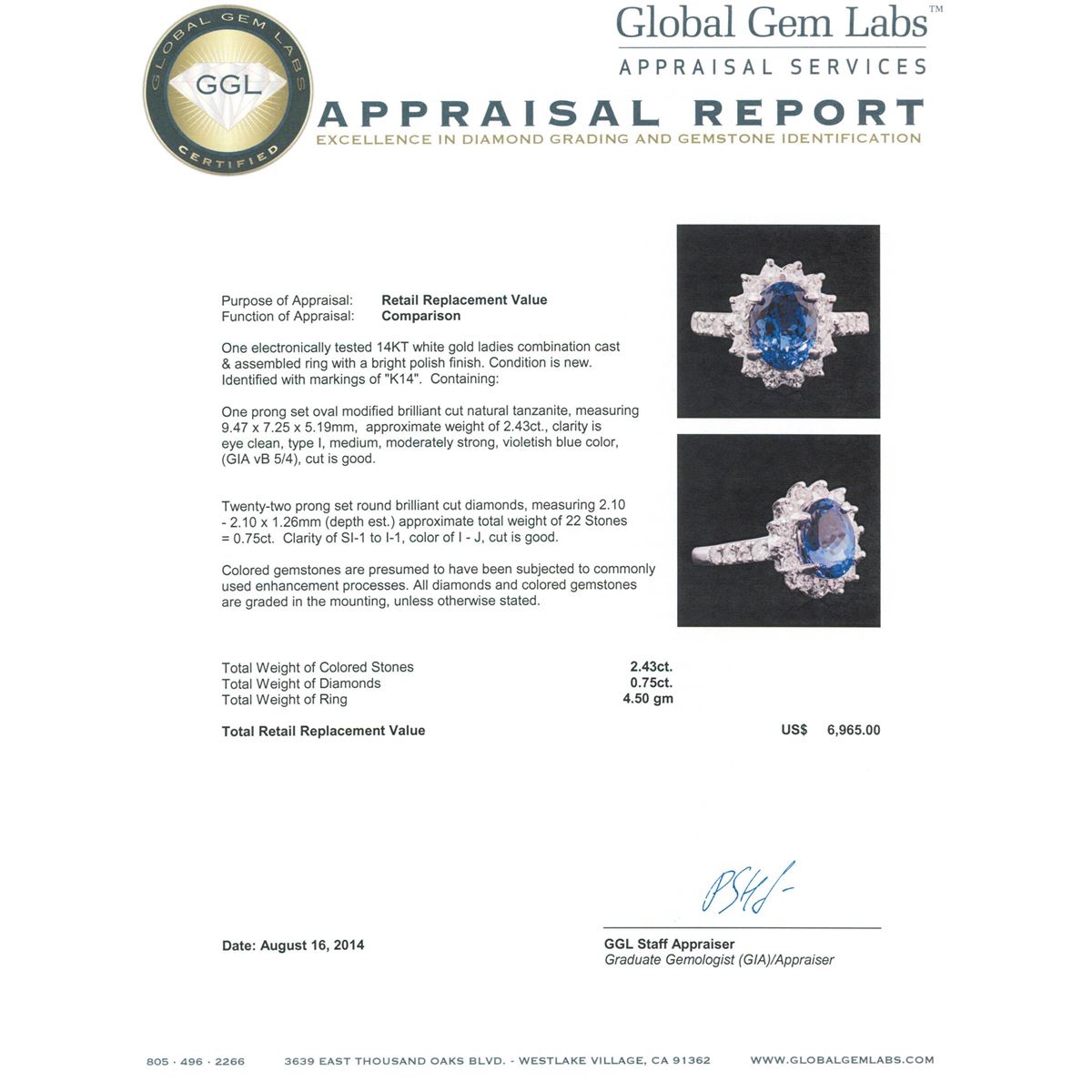 One electronically tested 14KT white gold ladies combination cast & assembled ring with a bright polish finish. Condition is new. Identified with markings of "K14". Containing: One prong set oval modified brilliant cut natural tanzanite, measuring 9.47 x 7.25 x 5.19mm, approximate weight of 2.43ct., clarity is eye clean, type I, medium, moderately strong, violetish blue color, (GIA vB 5/4), cut is good. Twenty-Two prong set round brilliant cut diamonds, measuring 2.10 - 2.10 x 1.26mm (depth est.) approximate. Total Weight of 22 Stones = 0.75ct. Clarity: SI-1 to I-1. Color: I - J, Cut is Good. Colored gemstones are presumed to have been subjected to commonly used enhancement processes. All diamonds and colored gemstones are graded in the mounting, unless otherwise stated. Total Weight of Colored Stones 2.43ct. Total Weight of Diamonds 0.75ct. Total Weight of Ring 4.50 grams. GGL Appraised at $6,965.00.