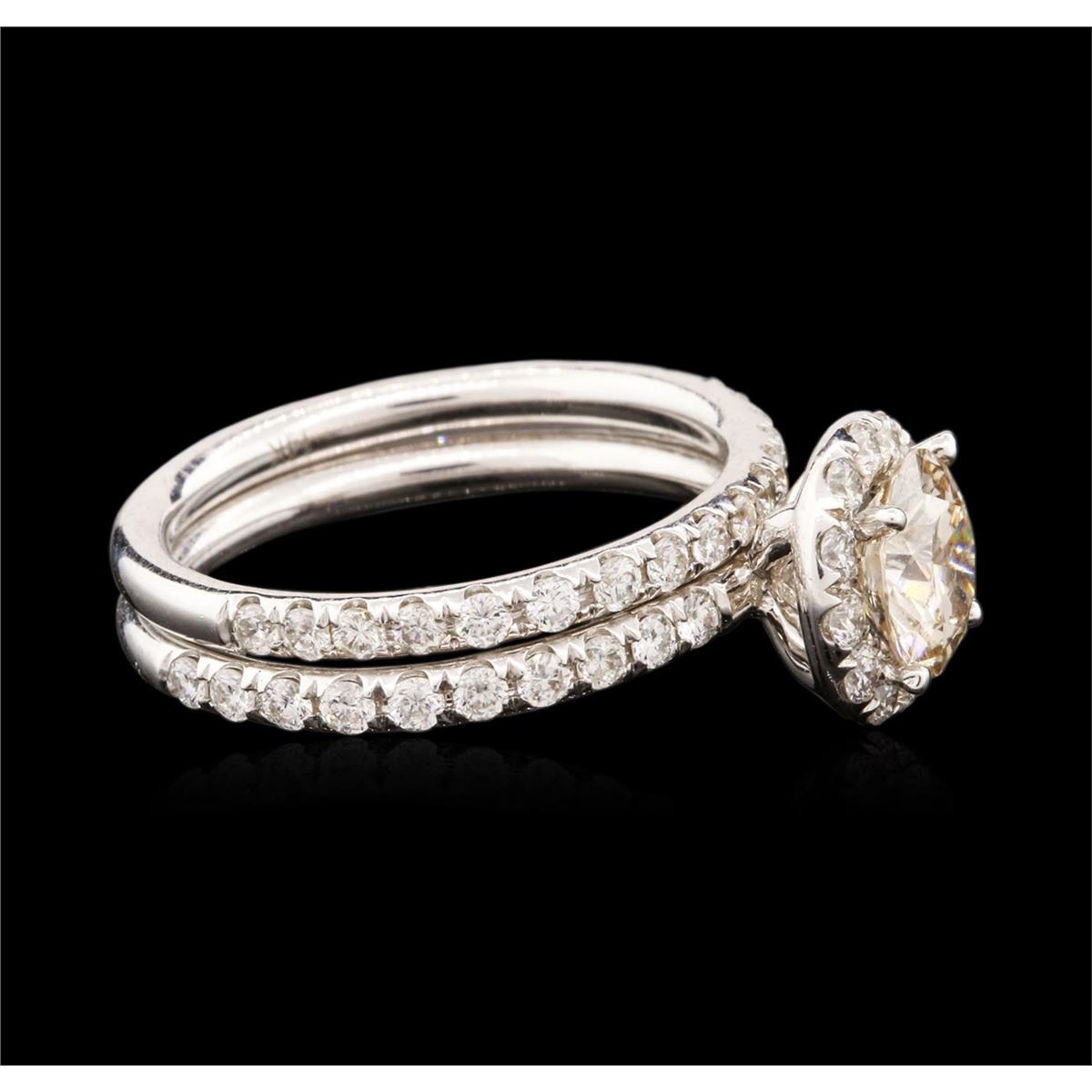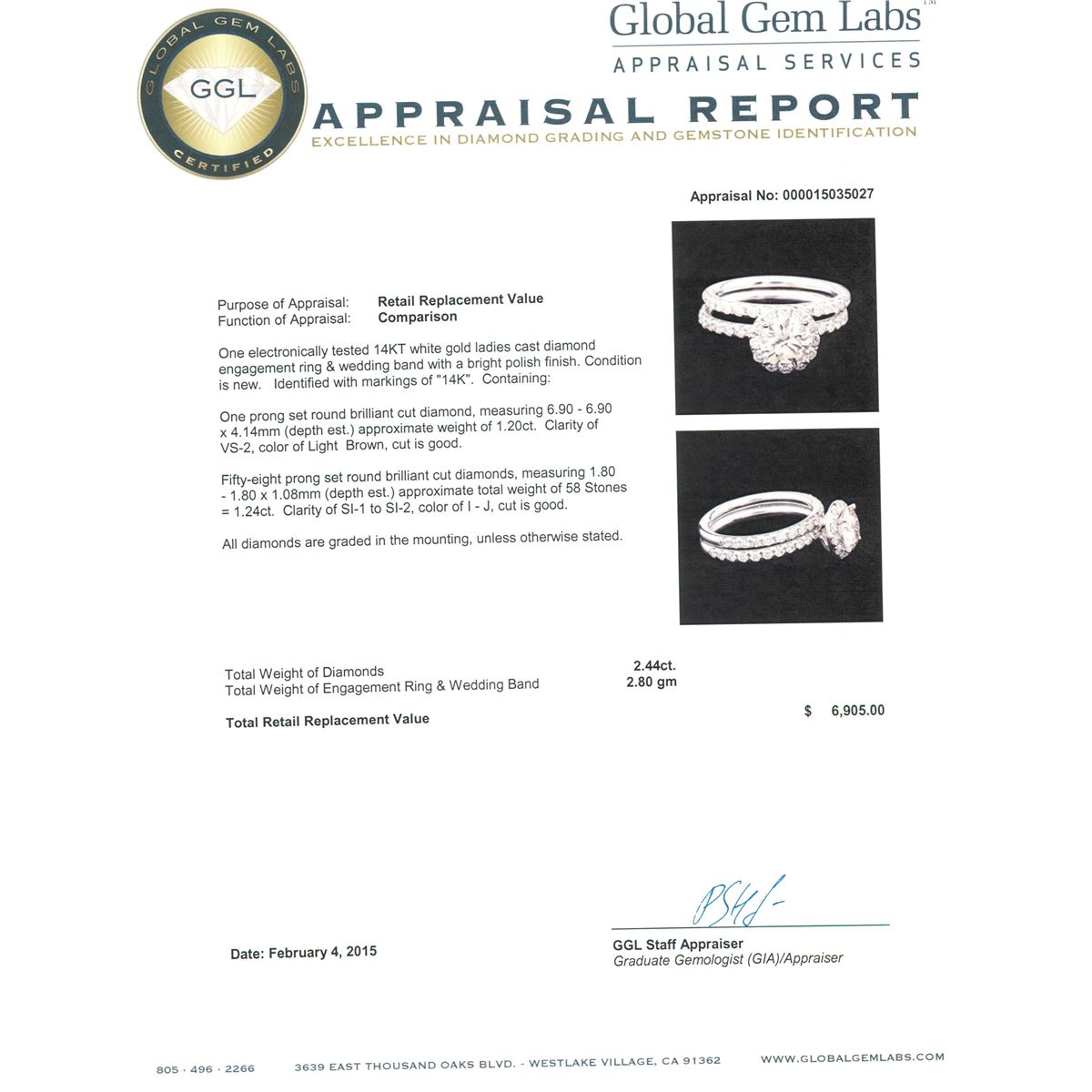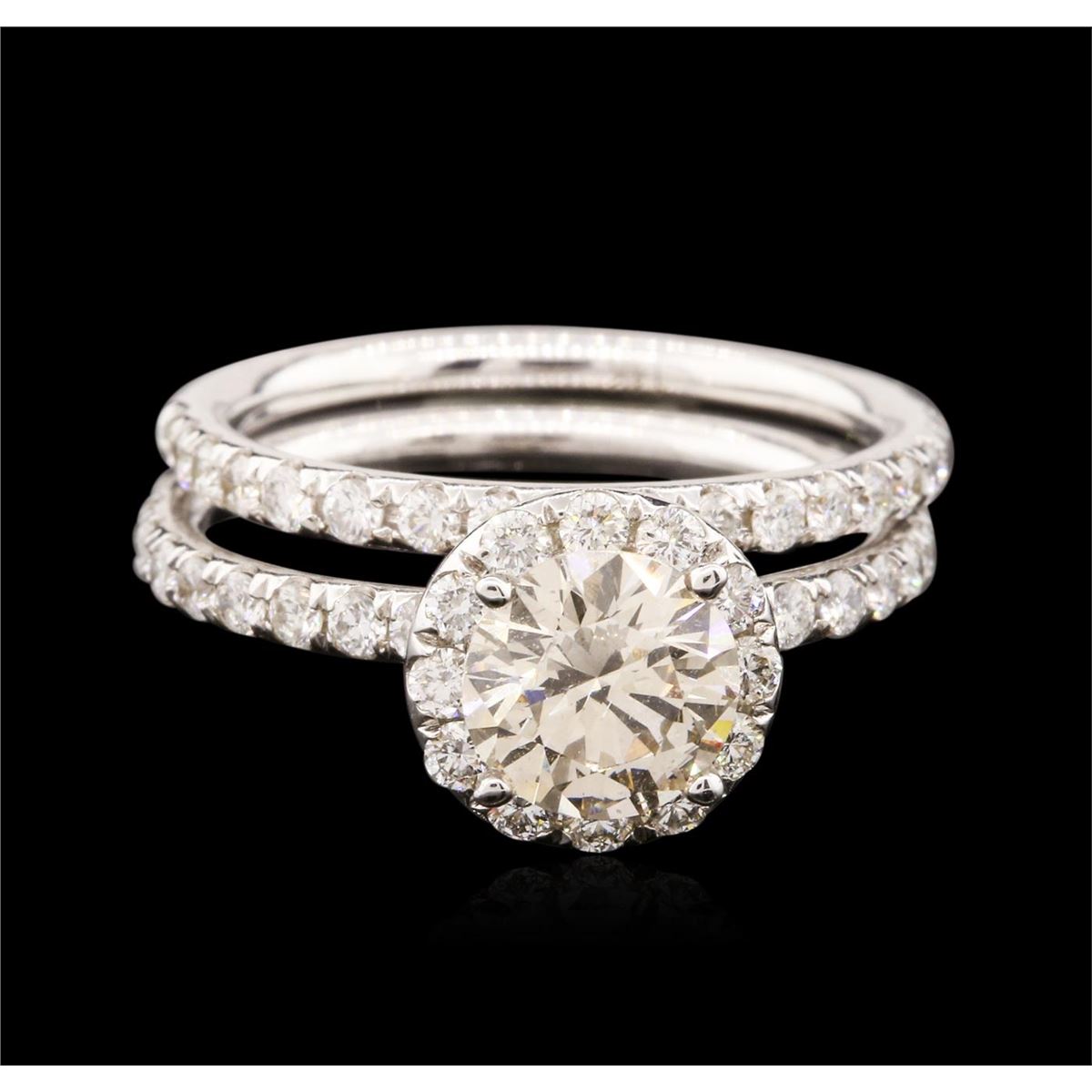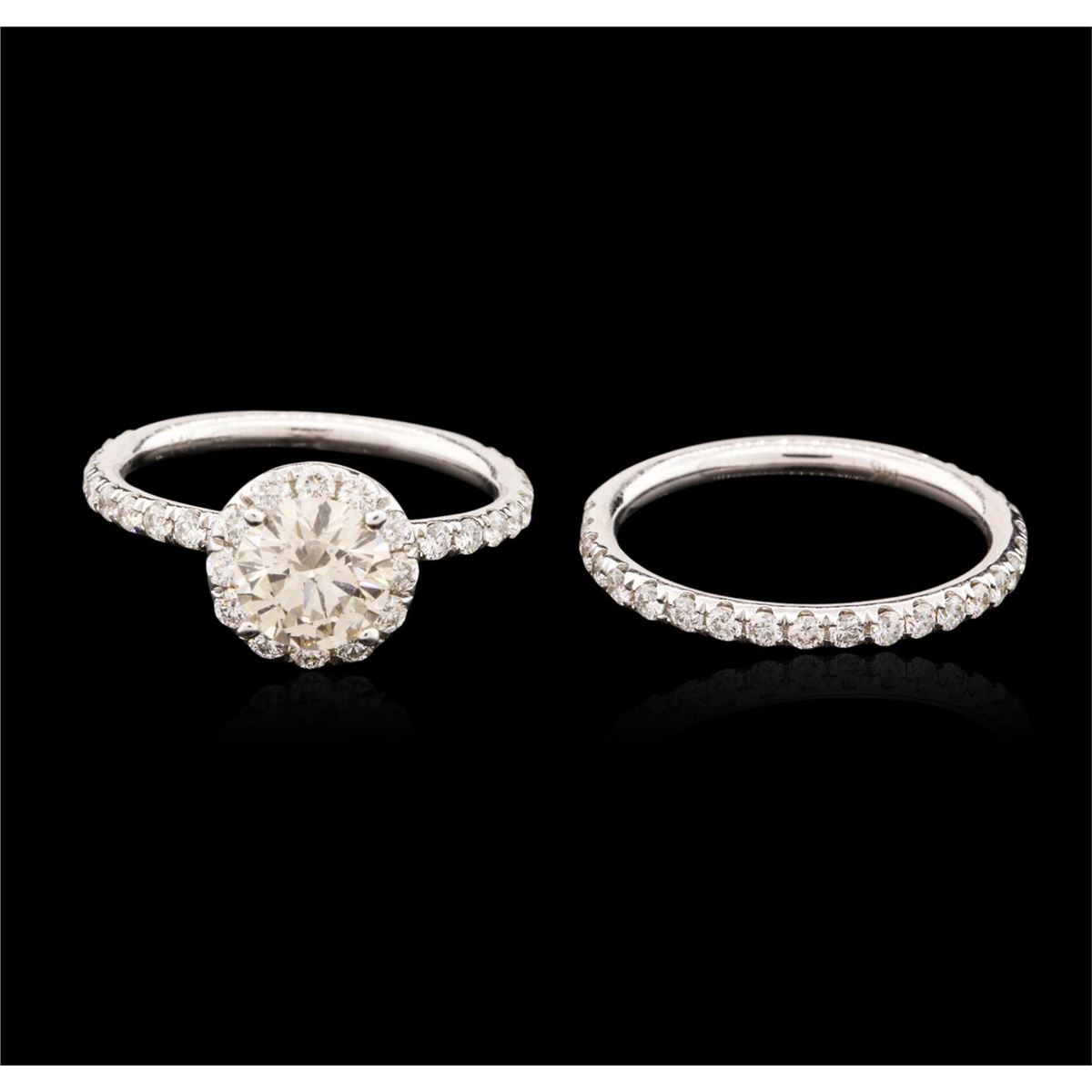 One electronically tested 14KT white gold ladies cast diamond engagement ring & wedding band with a bright polish finish. Identified with markings of "14K". Condition is new. Containing: One prong set round brilliant cut diamond, measuring 6.90 - 6.90 x 4.14mm (depth est.) approximate weight of 1.20ct. Clarity: VS-2, Cut is Good. Fifty-Eight prong set round brilliant cut diamonds, measuring 1.80 - 1.80 x 1.08mm (depth est.) approximate total weight of 58 Stones = 1.24ct. Clarity: SI-1 to SI-2. Color: I - J, Cut is Good. All diamonds are graded in the mounting, unless otherwise stated. Total Weight of Diamonds 2.44ct. Total Weight of Engagement Ring & Wedding Band 2.80 grams. GGL Appraised at $6,905.00.