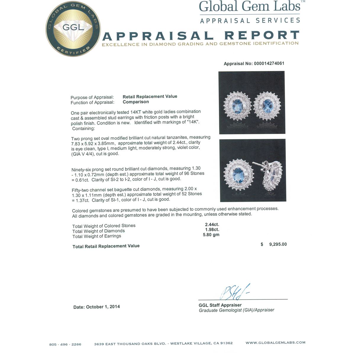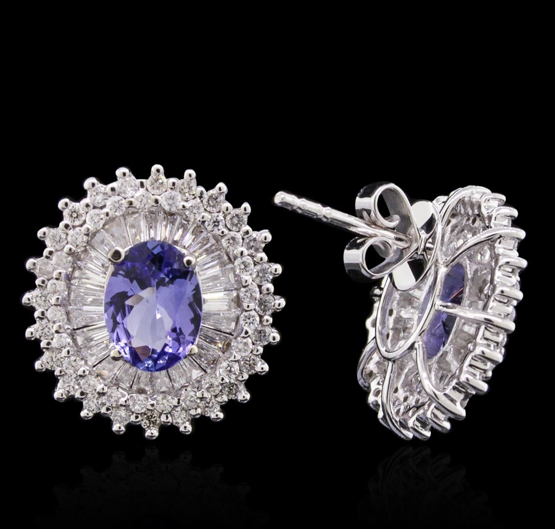 One pair electronically tested 14KT white gold ladies combination cast & assembled stud earrings with friction posts with a bright polish finish. Identified with markings of "14K". Condition is new. Containing: Two prong set oval modified brilliant cut natural tanzanites, measuring 7.83 x 5.92 x 3.85mm, approximate total weight of 2.44ct., clarity is eye clean, type I, medium light, moderately strong, violet color, (GIA V 4/4), cut is good. Ninety-Six prong set round brilliant cut diamonds, measuring 1.30 - 1.10 x 0.72mm (depth est.) approximate total weight of 96 Stones = 0.61ct. Clarity: SI-2 to I-2. Color: I - J, Cut is Good. Fifty-Two channel set baguette cut diamonds, measuring 2.00 x 1.30 x 1.11mm (depth est.) approximate total weight of 52 Stones = 1.37ct. Clarity: SI-1. Color: I - J, Cut is Good. Colored gemstones are presumed to have been subjected to commonly used enhancement processes. All diamonds and colored gemstones are graded in the mounting, unless otherwise stated. Total Weight of Colored Stones 2.44ct. Total Weight of Diamonds 1.98ct. Total Weight of Earrings 5.80 grams. GGL Appraised at $9,295.00.