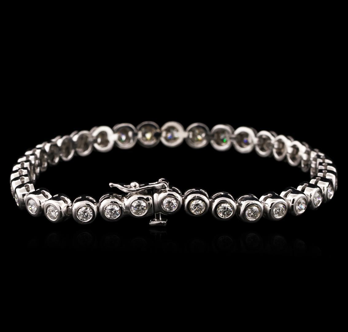 One electronically tested 14KT white gold ladies cast diamond tennis bracelet with a hidden box clasp with safety closer with a bright polish finish. Measurements: 7" in length Identified with markings of "14K". Condition is new. Containing: Thirty-Six bezel set round brilliant cut diamonds, measuring 2.70 - 2.70 x 1.62mm (depth est.) approximate total weight of 36 Stones = 2.45ct. Clarity: SI-2 to I-2. Color: H - I, Cut is Good. Diamonds are graded in the mounting, unless otherwise stated. Total Weight of Diamonds 2.45ct. Total Weight of Tennis Bracelet 17.30 grams. GGL Appraised at $5,920.00.