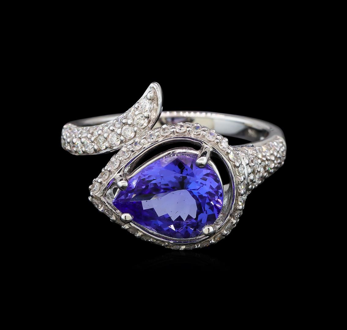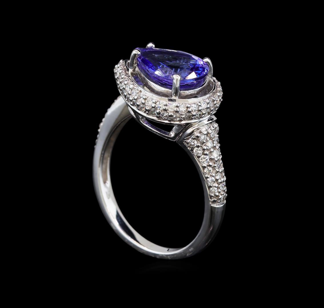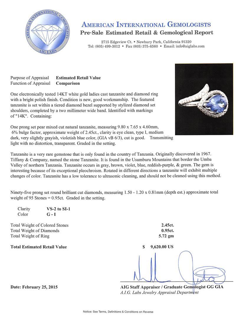 One electronically tested 14KT white gold ladies cast tanzanite and diamond ring with a bright polish finish. The featured tanzanite is set within a tiered diamond bezel supported by stylized diamond set shoulders, completed by a two millimeter wide band. Identified with markings of "14K". Condition is new, good workmanship. Containing: One prong set pear mixed cut natural tanzanite, measuring 9.80 x 7.65 x 4.60mm, 6%. bulge factor, approximate weight of 2.45ct., clarity is eye clean, type I, medium dark, very slightly grayish, violetish blue color, (GIA vB 6/3), cut is good. Transmitting light with no distortion, transparent. Graded in the setting. Tanzanite is a very rare gemstone that is only found in the country of Tanzania. Originally discovered in 1967. Tiffany & Company, named the stone Tanzanite. It is found in the Usumburu Mountains that border the Umba Valley of northern Tanzania. Tanzanite occurs in gray, brown, violet, blue, reddish-purple, & green. The gem is interesting because of its exceptional pleochroism. Rotated in different directions a tanzanite will exhibit multiple changes of color. Tanzanite has a low tolerance to ultrasonic cleaning, and should not be cleaned using this method. Ninety-Five prong set round brilliant cut diamonds, measuring 1.50 - 1.20 x 0.81mm (depth est.) approximate total weight of 95 Stones = 0.95ct. Graded in the setting. Clarity: VS-2 to SI-1. Color: G - I. Total Weight of Colored Stones 2.45ct. Total Weight of Diamonds 0.95ct. Total Weight of Ring 5.72 grams. AIG Appraised at $9,620.00.
