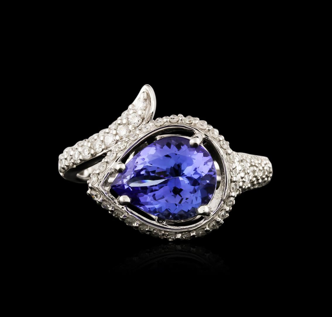 One electronically tested 14KT white gold ladies cast tanzanite and diamond ring with a bright polish finish. The featured tanzanite is set within a tiered diamond bezel supported by stylized diamond set shoulders, completed by a two millimeter wide band. Identified with markings of "14K". Condition is new, good workmanship. Containing: One prong set pear mixed cut natural tanzanite, measuring 9.80 x 7.65 x 4.60mm, 6%. bulge factor, approximate weight of 2.45ct., clarity is eye clean, type I, medium dark, very slightly grayish, violetish blue color, (GIA vB 6/3), cut is good. Transmitting light with no distortion, transparent. Graded in the setting. Tanzanite is a very rare gemstone that is only found in the country of Tanzania. Originally discovered in 1967. Tiffany & Company, named the stone Tanzanite. It is found in the Usumburu Mountains that border the Umba Valley of northern Tanzania. Tanzanite occurs in gray, brown, violet, blue, reddish-purple, & green. The gem is interesting because of its exceptional pleochroism. Rotated in different directions a tanzanite will exhibit multiple changes of color. Tanzanite has a low tolerance to ultrasonic cleaning, and should not be cleaned using this method. Ninety-Five prong set round brilliant cut diamonds, measuring 1.50 - 1.20 x 0.81mm (depth est.) approximate total weight of 95 Stones = 0.95ct. Graded in the setting. Clarity: VS-2 to SI-1. Color: G - I. Total Weight of Colored Stones 2.45ct. Total Weight of Diamonds 0.95ct. Total Weight of Ring 5.72 grams. AIG Appraised at $9,620.00.