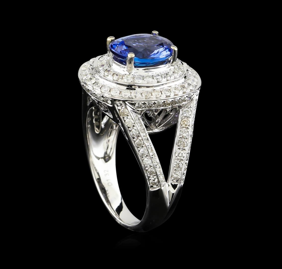 One electronically tested 14KT white gold ladies combination cast & assembled tanzanite and diamond ring with a split shank with a bright polish finish. Identified with markings of "14K". Condition is new. Containing: One prong set oval modified brilliant cut natural tanzanite, measuring 9.78 x 7.54 x 4.90mm, approximate weight of 2.46ct., clarity is eye clean, type I, medium, moderately strong, violet color, (GIA V 5/4), cut is good. One Hundred Twenty-Six prong set round brilliant cut diamonds, measuring 1.20 - 1.20 x 0.72mm (depth est.) approximate total weight of 126 Stones = 0.79ct. Clarity: I-1 to I-2. Color: I - J, Cut is Good. Colored gemstones are presumed to have been subjected to commonly used enhancement processes. All diamonds and colored gemstones are graded in the mounting, unless otherwise stated. Total Weight of Colored Stones 2.46ct. Total Weight of Diamonds 0.79ct. Total Weight of Ring 7.00 grams. GGL Appraised at $6,840.00.