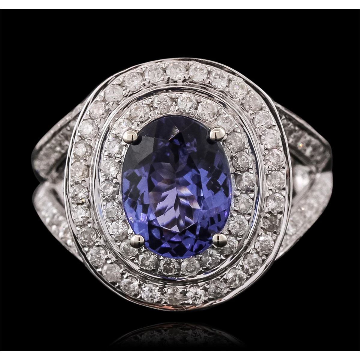 One electronically tested 14KT white gold ladies combination cast & assembled tanzanite and diamond ring with a split shank with a bright polish finish. Identified with markings of "14K". Condition is new. Containing: One prong set oval modified brilliant cut natural tanzanite, measuring 9.78 x 7.54 x 4.90mm, approximate weight of 2.46ct., clarity is eye clean, type I, medium, moderately strong, violet color, (GIA V 5/4), cut is good. One Hundred Twenty-Six prong set round brilliant cut diamonds, measuring 1.20 - 1.20 x 0.72mm (depth est.) approximate total weight of 126 Stones = 0.79ct. Clarity: I-1 to I-2. Color: I - J, Cut is Good. Colored gemstones are presumed to have been subjected to commonly used enhancement processes. All diamonds and colored gemstones are graded in the mounting, unless otherwise stated. Total Weight of Colored Stones 2.46ct. Total Weight of Diamonds 0.79ct. Total Weight of Ring 7.00 grams. GGL Appraised at $6,840.00.