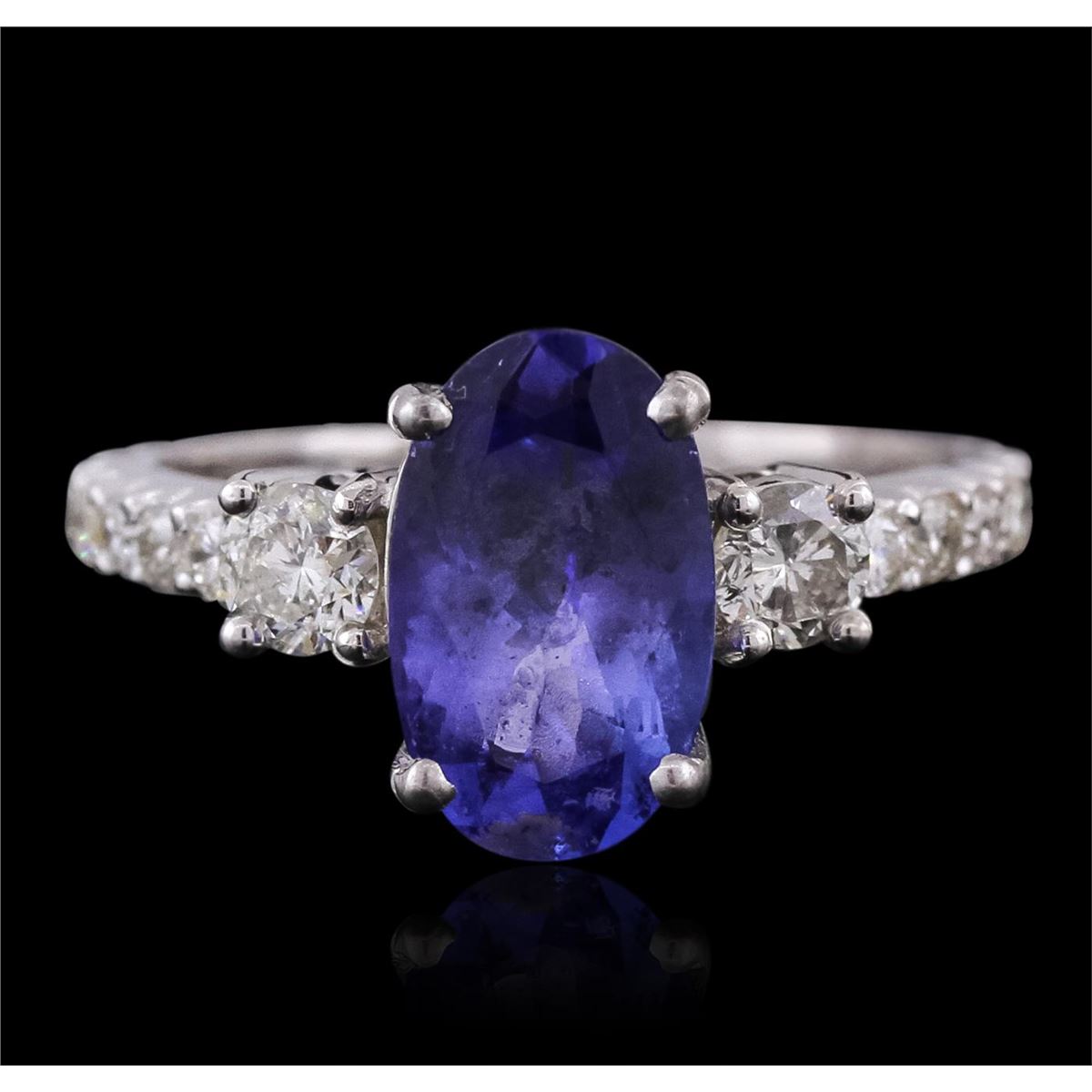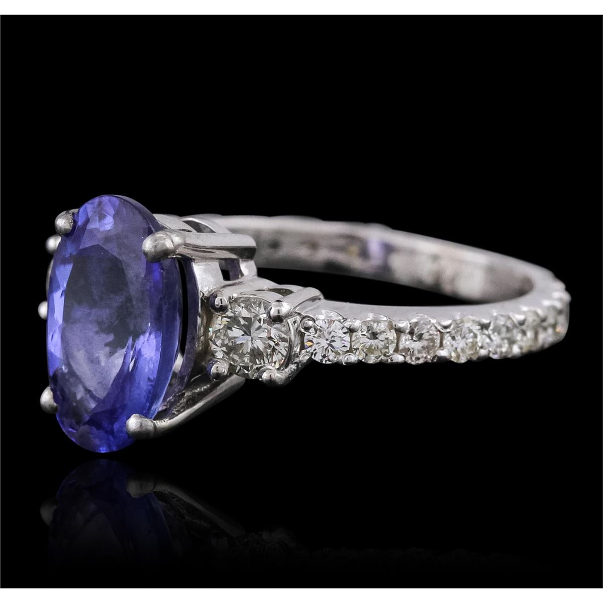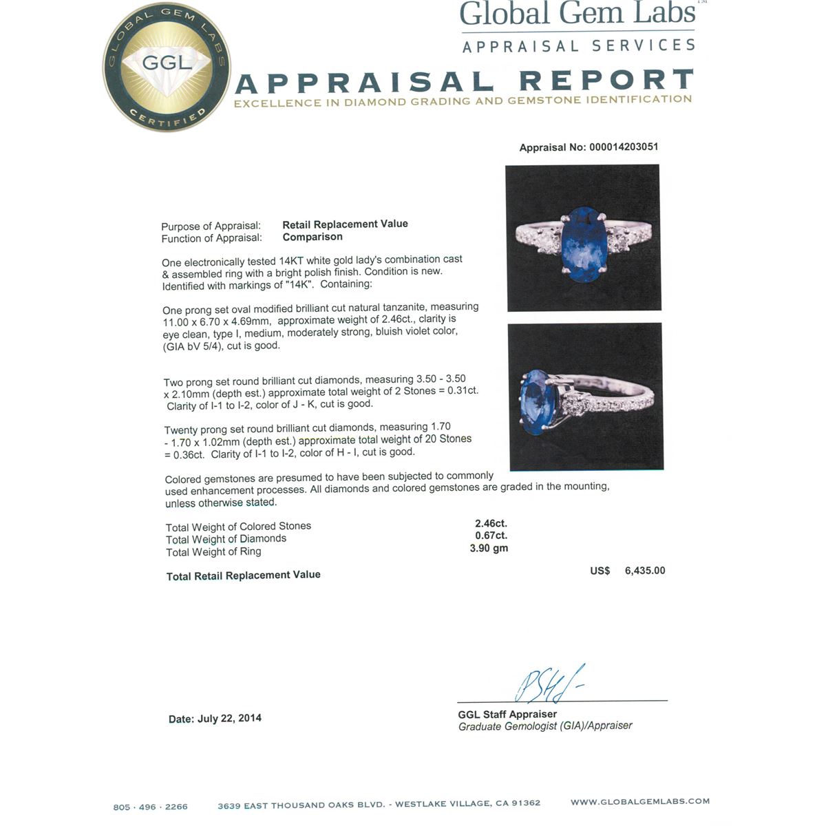 One electronically tested 14KT white gold ladies combination cast & assembled ring with a bright polish finish. Condition is new. Identified with markings of "14K". Containing: One prong set oval modified brilliant cut natural tanzanite, measuring 11.00 x 6.70 x 4.69mm, approximate weight of 2.46ct., clarity is eye clean, type I, medium, moderately strong, bluish violet color, (GIA bV 5/4), cut is good. Two prong set round brilliant cut diamonds, measuring 3.50 - 3.50 x 2.10mm (depth est.) approximate total weight of 2 Stones = 0.31ct. Clarity: I-1 to I-2. Color: J - K, Cut is Good. Twenty prong set round brilliant cut diamonds, measuring 1.70 - 1.70 x 1.02mm (depth est.) approximate total weight of 20 Stones = 0.36ct. Clarity: I-1 to I-2. Color: H - I, Cut is Good. Colored gemstones are presumed to have been subjected to commonly used enhancement processes. All diamonds and colored gemstones are graded in the mounting, unless otherwise stated. Total Weight of Colored Stones 2.46ct. Total Weight of Diamonds 0.67ct. Total Weight of Ring 3.90 grams. GGL Appraised at $6,435.00.