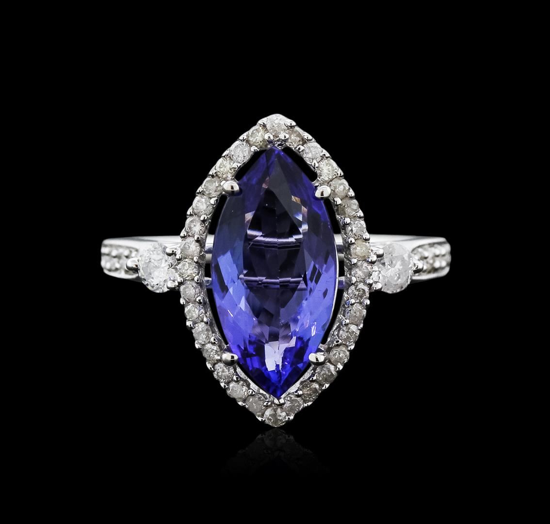 One electronically tested 14KT white gold ladies cast tanzanite and diamond ring with a flat shank with rounded edges with a bright polish finish. Trademark is Orianne. Identified with markings of "14K". Condition is new. Containing: One prong set marquise modified brilliant cut natural tanzanite, measuring 14.34 x 7.10 x 3.80mm, approximate weight of 2.46ct., clarity is eye clean, type I, medium light, very slightly grayish, violet color, (GIA V 4/3), cut is good. Two prong set round brilliant cut diamonds, measuring 2.50 - 2.50 x 1.50mm (depth est.) approximate total weight of 2 Stones = 0.11ct. Clarity: I-1 to I-2. Color: I - J. Forty-Two prong set round brilliant cut diamonds, measuring 1.10 - 1.10 x 0.66mm (depth est.) approximate total weight of 42 Stones = 0.20ct. Clarity: I-1 to I-2. Color: I - J. All diamonds and colored gemstones are graded in the mounting, unless otherwise stated. Colored gemstones are presumed to have been subjected to commonly used enhancement processes. Total Weight of Colored Stones 2.46ct. Total Weight of Diamonds 0.32ct. Total Weight of Ring 3.00 grams. GGL Appraised at $3,110.00.