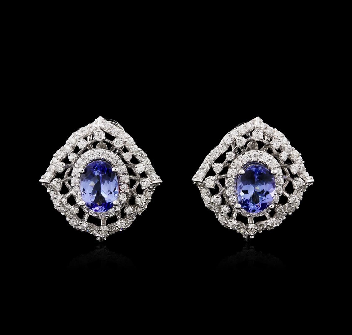 One pair electronically tested 14KT white gold ladies cast tanzanite and diamond earrings with Omega clip backs with a bright polish finish. Condition is new. Containing: Two prong set oval modified brilliant cut natural tanzanites, measuring 8.00. x 5.80 x 3.77mm, approximate total weight of 2.46ct., clarity is eye clean, type I, medium light, very slightly grayish, violet color, (GIA V 4/3), cut is good. One Hundred Sixty-Eight prong set round brilliant cut diamonds, measuring 1.50 - 1.20 x 0.81mm (depth est.) approximate total weight of 168 Stones = 1.51ct. Clarity: SI-2 to I-1. Color: I - J, Cut is Good. Colored gemstones are presumed to have been subjected to commonly used enhancement processes. All diamonds and colored gemstones are graded in the mounting, unless otherwise stated. Total Weight of Colored Stones 2.46ct. Total Weight of Diamonds 1.51ct. Total Weight of Earrings 8.00. grams. GGL Appraised at $4,630.00.