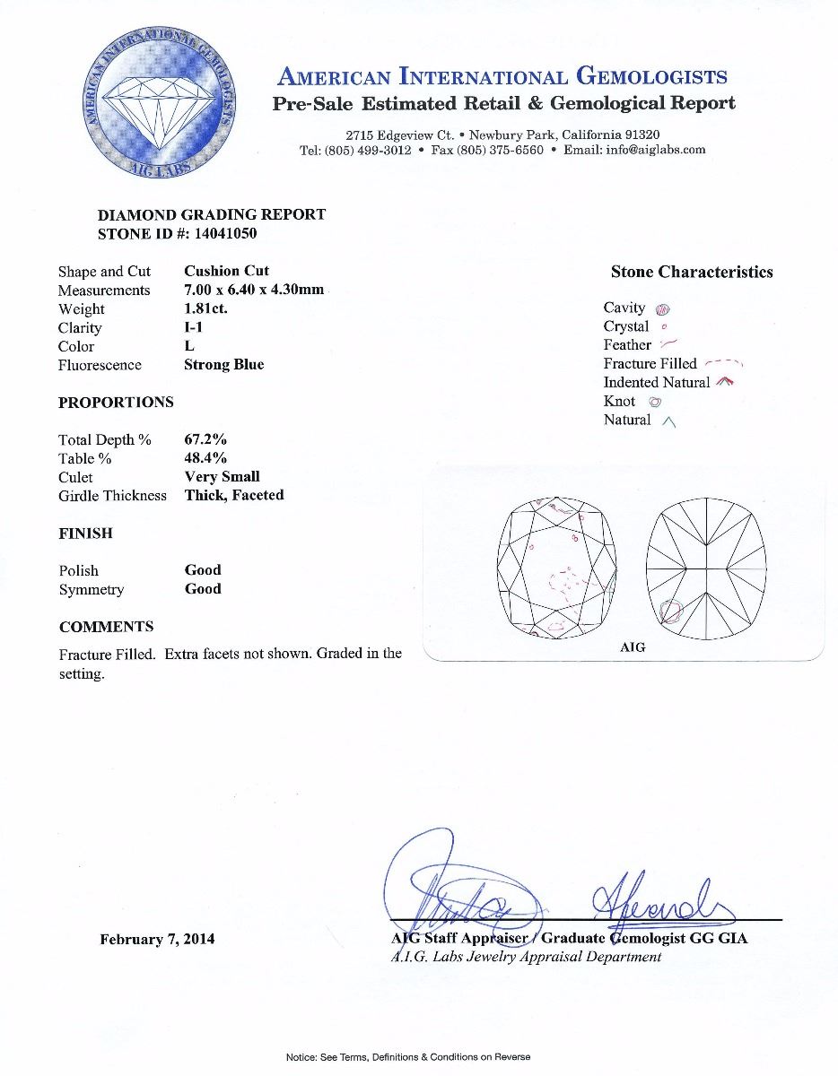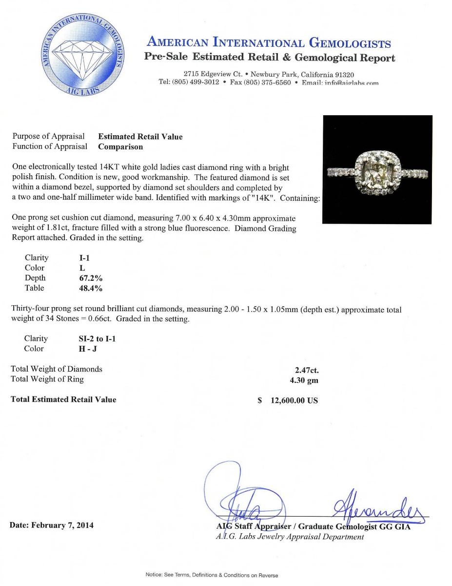 One electronically tested 14KT white gold ladies cast diamond ring with a bright polish finish. Condition is new, good workmanship. The featured diamond is set within a diamond bezel, supported by diamond set shoulders and completed by a two and one-half millimeter wide band. Identified with markings of "14K". Containing: One prong set cushion cut diamond, measuring 7.00 x 6.40 x 4.30mm approximate weight of 1.81ct, clarity enhanced with a strong blue fluorescence. Diamond Grading Report attached. Graded in the setting. Clarity: I-1. Color: L Depth 67.2%. Table 48.4%. Thirty-Four prong set round brilliant cut diamonds, measuring 2.00 - 1.50 x 1.05mm (depth est.) approximate. Total Weight of 34 Stones = 0.66ct. Graded in the setting. Clarity: SI-2 to I-1. Color: H - J. Total Weight of Diamonds 2.47ct. Total Weight of Ring 4.30 grams. AIG Appraised at $12,600.00.