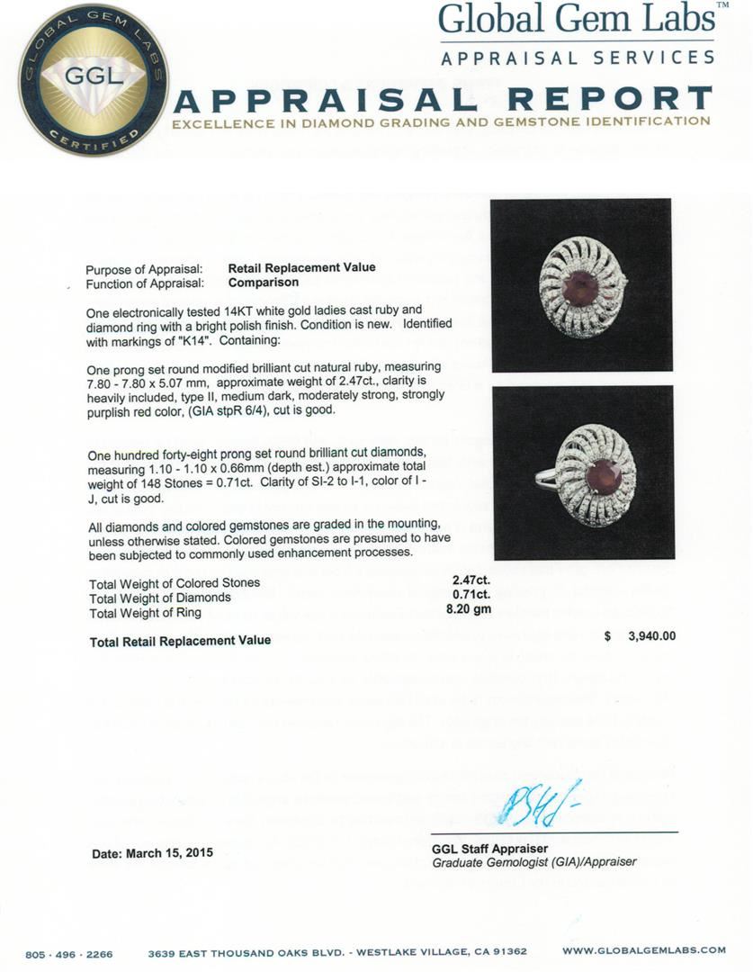 One electronically tested 14KT white gold ladies cast ruby and diamond ring with a bright polish finish. Identified with markings of "K14". Condition is new.Containing: One prong set round modified brilliant cut natural ruby, measuring 7.80 - 7.80 x 5.07 mm, approximate weight of 2.47ct., clarity is heavily included, type II, medium dark, moderately strong, strongly purplish red color, (GIA stpR 6/4), cut is good. One Hundred Forty-Eight prong set round brilliant cut diamonds, measuring 1.10 - 1.10 x 0.66mm (depth est.) approximate total weight of 148 Stones = 0.71ct. Clarity of SI-2 to I-1, Color of I - J, Cut is Good. All diamonds and colored gemstones are graded in the mounting, unless otherwise stated. Colored gemstones are presumed to have been subjected to commonly used enhancement processes. Total Weight of Colored Stones 2.47ct. Total Weight of Diamonds 0.71ct. Total Weight of Ring 8.20 grams. GGL Appraised.