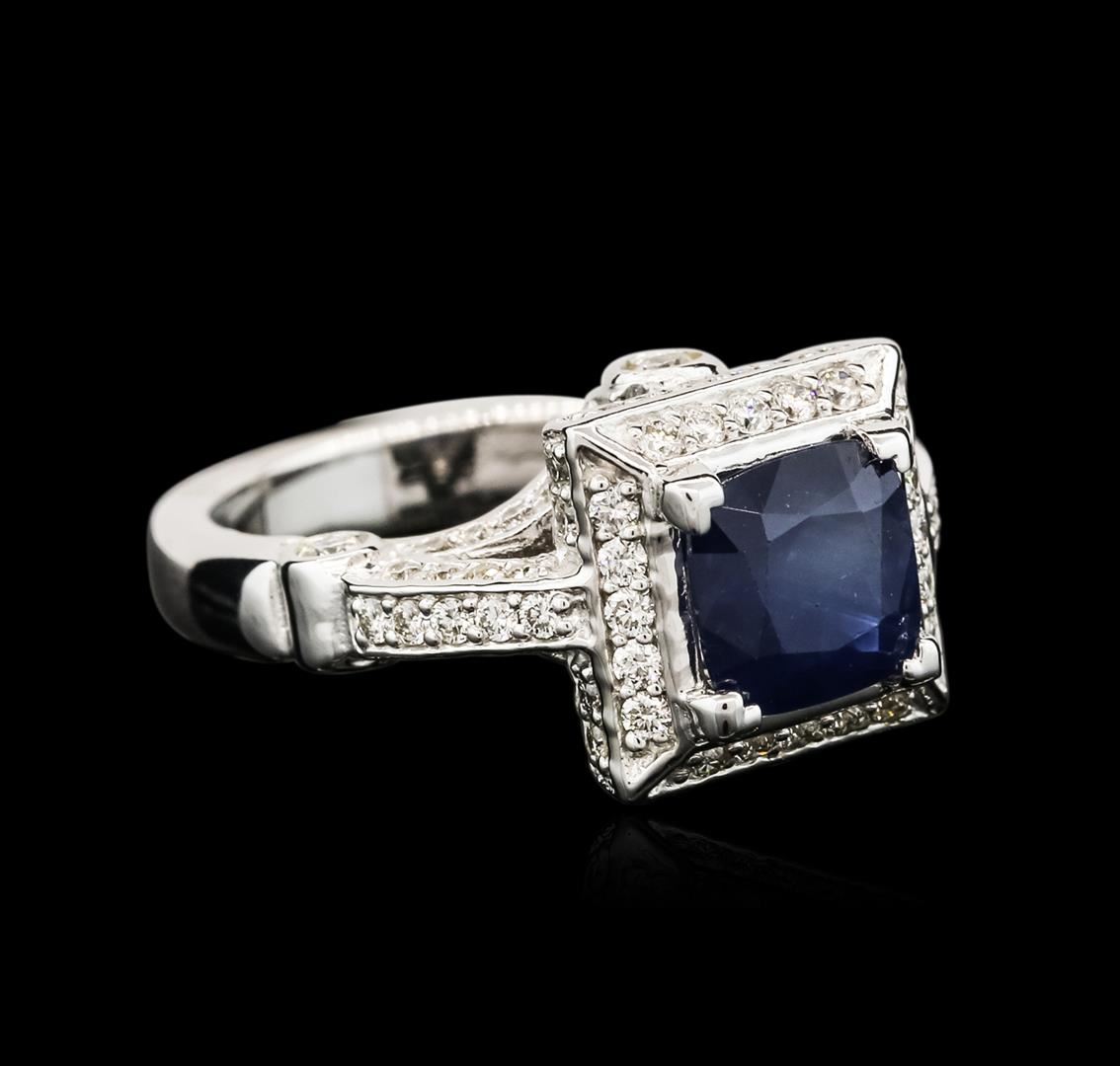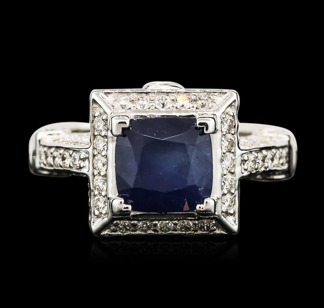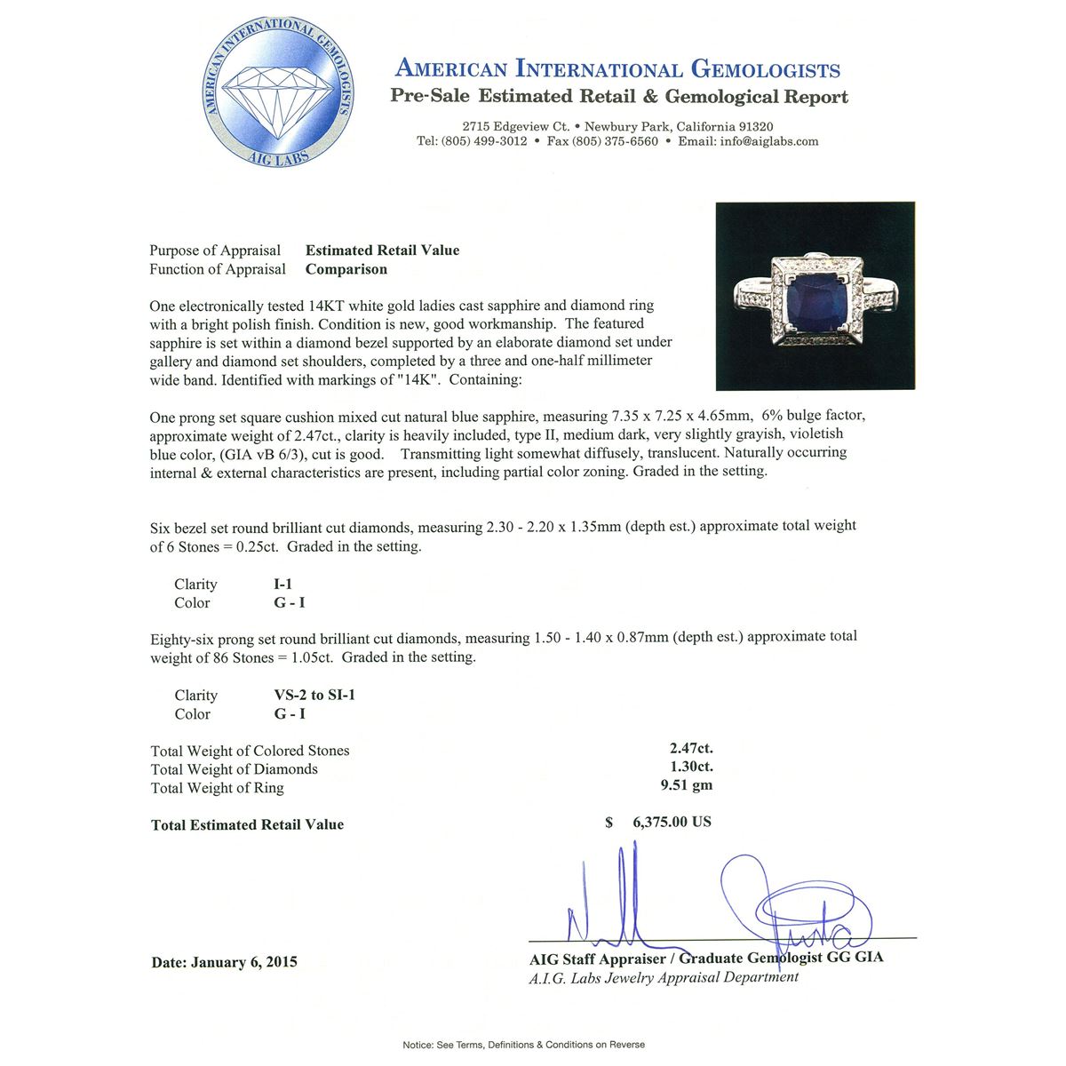 One electronically tested 14KT white gold ladies cast sapphire and diamond ring with a bright polish finish. The featured sapphire is set within a diamond bezel supported by an elaborate diamond set under gallery and diamond set shoulders, completed by a three and one-half millimeter wide band. Identified with markings of "14K". Condition is new, good workmanship. Containing: One prong set square cushion mixed cut natural blue sapphire, measuring 7.35 x 7.25 x 4.65mm, 6% bulge factor, approximate weight of 2.47ct., clarity is heavily included, type II, medium dark, very slightly grayish, violetish blue color, (GIA vB 6/3), cut is good. Transmitting light somewhat diffusely, translucent. Naturally occurring internal & external characteristics are present, including partial color zoning. Graded in the setting. Six bezel set round brilliant cut diamonds, measuring 2.30 - 2.20 x 1.35mm (depth est.) approximate total weight of 6 Stones = 0.25ct. Graded in the setting. Clarity: I-1. Color: G - I Eighty-Six prong set round brilliant cut diamonds, measuring 1.50 - 1.40 x 0.87mm (depth est.) approximate total weight of 86 Stones = 1.05ct. Graded in the setting. Clarity: VS-2 to SI-1. Color: G - I. Total Weight of Colored Stones 2.47ct. Total Weight of Diamonds 1.30ct. Total Weight of Ring 9.51 grams. AIG Appraised at $6,375.00.