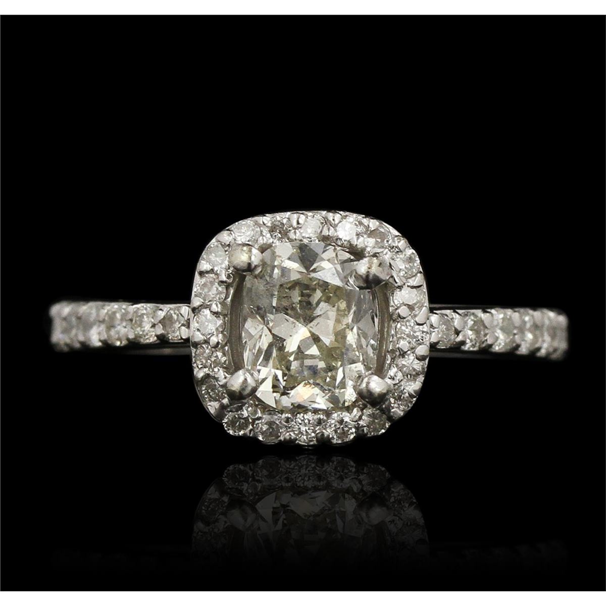 One electronically tested 14KT white gold ladies cast diamond ring with a bright polish finish. Condition is new, good workmanship. The featured diamond is set within a diamond bezel, supported by diamond set shoulders and completed by a two and one-half millimeter wide band. Identified with markings of "14K". Containing: One prong set cushion cut diamond, measuring 7.00 x 6.40 x 4.30mm approximate weight of 1.81ct, clarity enhanced with a strong blue fluorescence. Diamond Grading Report attached. Graded in the setting. Clarity: I-1. Color: L Depth 67.2%. Table 48.4%. Thirty-Four prong set round brilliant cut diamonds, measuring 2.00 - 1.50 x 1.05mm (depth est.) approximate. Total Weight of 34 Stones = 0.66ct. Graded in the setting. Clarity: SI-2 to I-1. Color: H - J. Total Weight of Diamonds 2.47ct. Total Weight of Ring 4.30 grams. AIG Appraised at $12,600.00.