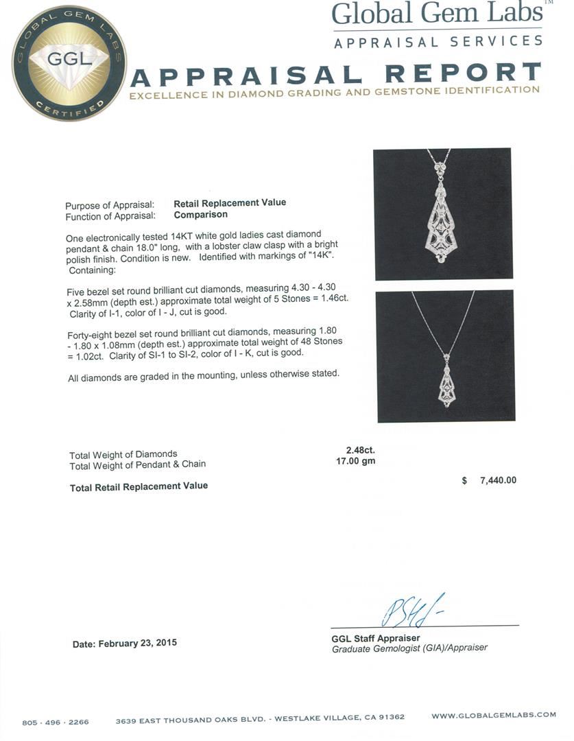One electronically tested 14KT white gold ladies cast diamond pendant & chain 18.0" long, with a lobster claw clasp with a bright polish finish. Identified with markings of "14K". Condition is new. Containing: Five bezel set round brilliant cut diamonds, measuring 4.30 - 4.30 x 2.58mm (depth est.) approximate total weight of 5 Stones = 1.46ct. Clarity: I-1. Color: I - J, Cut is Good. Forty-Eight bezel set round brilliant cut diamonds, measuring 1.80 - 1.80 x 1.08mm (depth est.) approximate total weight of 48 Stones = 1.02ct. Clarity: SI-1 to SI-2. Color: I - K, Cut is Good. All diamonds are graded in the mounting, unless otherwise stated. Total Weight of Diamonds 2.48ct. Total Weight of Pendant & Chain 17.00 grams. GGL Appraised.