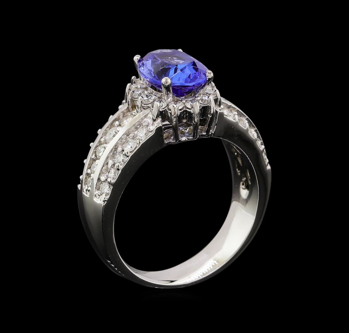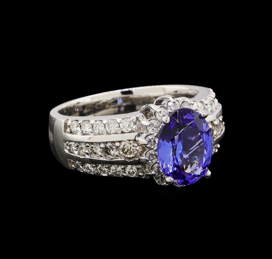 One electronically tested 14KT white gold ladies cast tanzanite and diamond ring with a bright polish finish. Identified with markings of "K14". Condition is new. Containing: One prong set oval modified brilliant cut natural tanzanite, measuring 9.90 x 7.40 x 4.81mm, approximate weight of 2.48ct., clarity is eye clean, type I, medium light, very slightly grayish, violet color, (GIA V 4/3), cut is good. Forty-Four prong set round brilliant cut diamonds, measuring 2.20 - 1.50 x 1.11mm (depth est.) approximate total weight of 44 Stones = 0.80ct. Clarity: SI-2 to I-1. Color: I - K, Cut is Good. Colored gemstones are presumed to have been subjected to commonly used enhancement processes. All diamonds and colored gemstones are graded in the mounting, unless otherwise stated. Total Weight of Colored Stones 2.48ct. Total Weight of Diamonds 0.80ct. Total Weight of Ring 8.30 grams. GGL Appraised at $5,575.00.