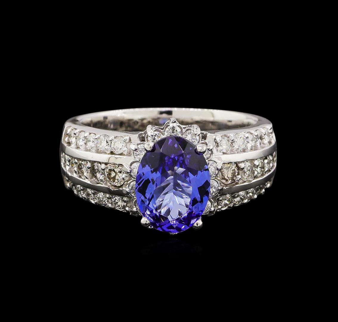 One electronically tested 14KT white gold ladies cast tanzanite and diamond ring with a bright polish finish. Identified with markings of "K14". Condition is new. Containing: One prong set oval modified brilliant cut natural tanzanite, measuring 9.90 x 7.40 x 4.81mm, approximate weight of 2.48ct., clarity is eye clean, type I, medium light, very slightly grayish, violet color, (GIA V 4/3), cut is good. Forty-Four prong set round brilliant cut diamonds, measuring 2.20 - 1.50 x 1.11mm (depth est.) approximate total weight of 44 Stones = 0.80ct. Clarity: SI-2 to I-1. Color: I - K, Cut is Good. Colored gemstones are presumed to have been subjected to commonly used enhancement processes. All diamonds and colored gemstones are graded in the mounting, unless otherwise stated. Total Weight of Colored Stones 2.48ct. Total Weight of Diamonds 0.80ct. Total Weight of Ring 8.30 grams. GGL Appraised at $5,575.00.