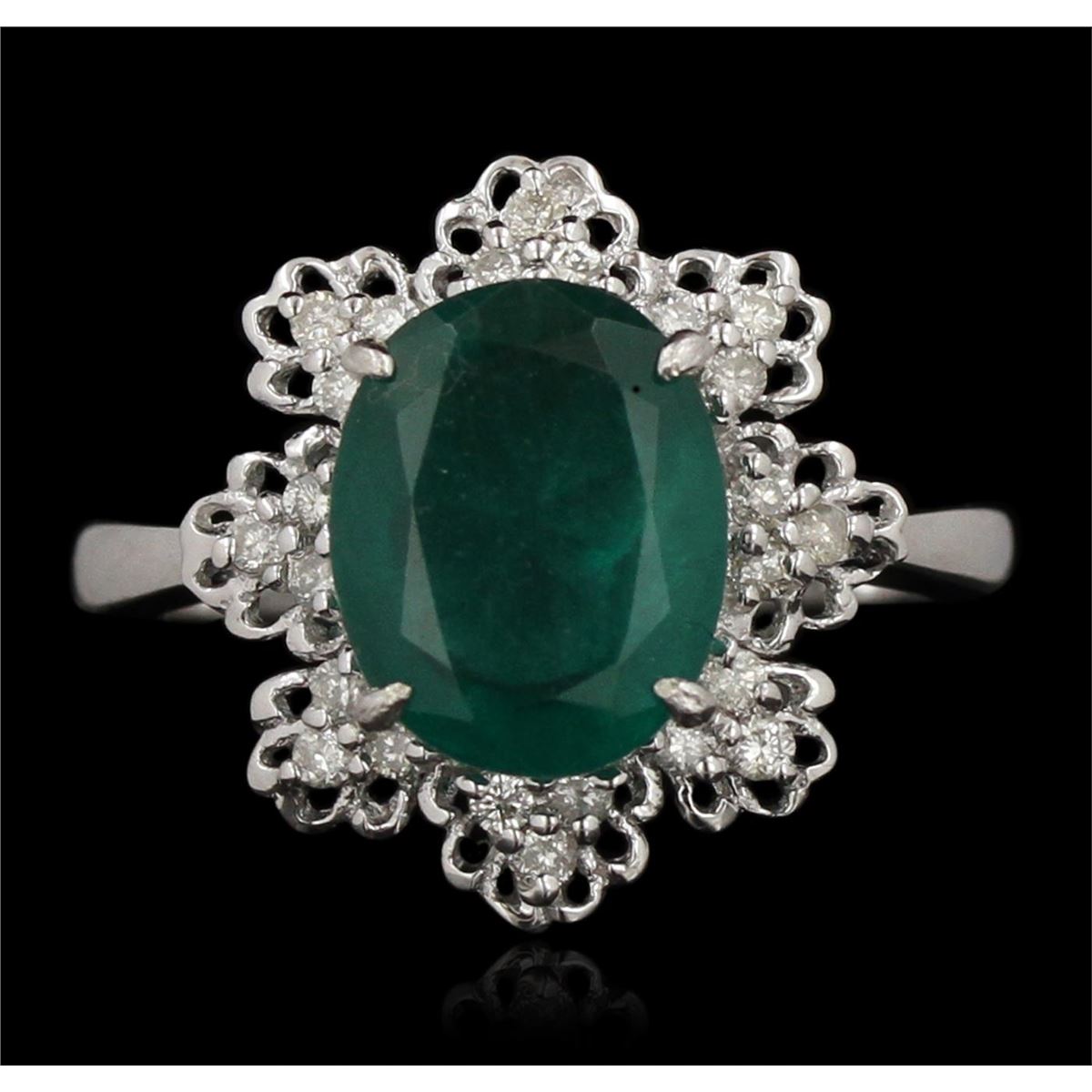 One electronically tested 14KT white gold Ladies combination cast & assembled cocktail ring with a bright polish finish. Identified with markings of "14K". Condition is excellent. Containing: One prong set oval modified brilliant cut natural emerald, measuring 10.60 x 8.40 x 3.90mm, approximate weight of 2.48ct., clarity is heavily included, type III, medium dark, moderately strong, green color, (GIA G 6/4), cut is good. Colored gemstones are presumed to have been subjected to commonly used and possible undetectable color/clarity enhancement processes. Twenty-Four prong set round brilliant cut diamonds, measuring 1.30 - 1.30 x 0.78mm (depth est.) approximate total weight of 24 Stones = 0.26ct. Clarity of I-1, Color of J. Total Weight of Colored Stones 2.48ct. Total Weight of Diamonds 0.26ct. Total Weight of Ring 3.40gm. GGL Appraised at $5,985.00.