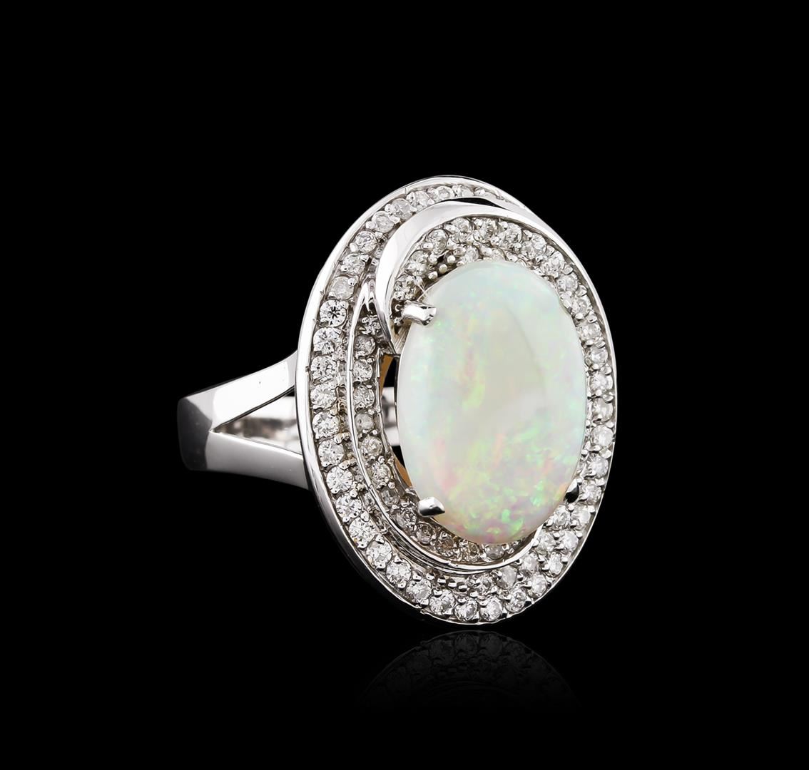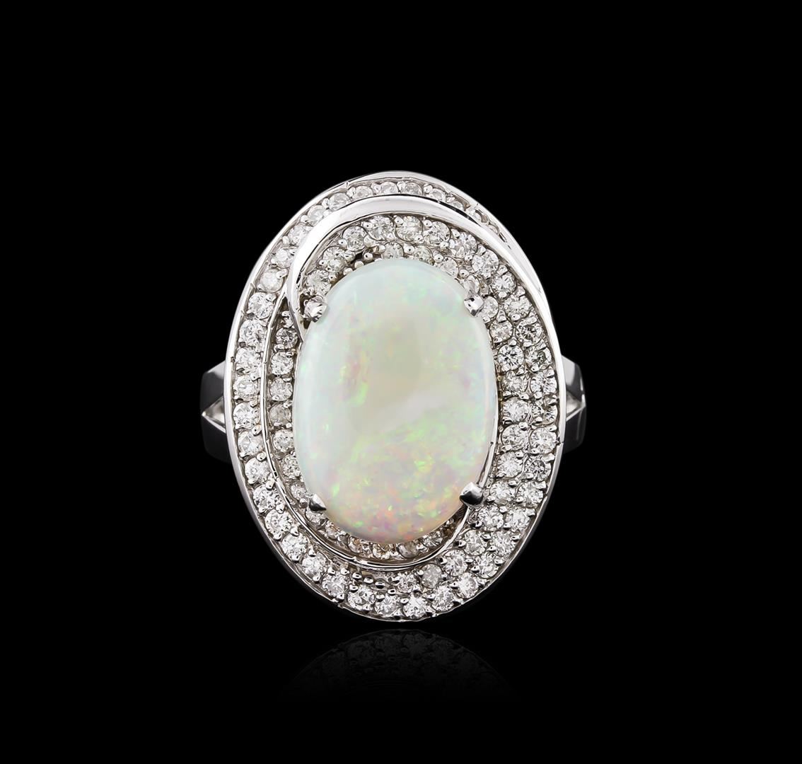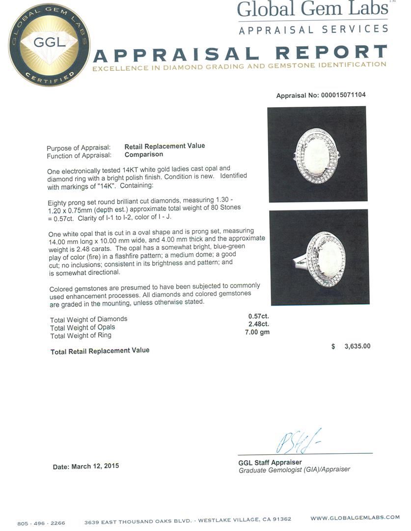 One electronically tested 14KT white gold ladies cast opal and diamond ring with a bright polish finish. Identified with markings of "14K". Condition is new. Containing: Eighty prong set round brilliant cut diamonds, measuring 1.30 - 1.20 x 0.75mm (depth est.) approximate total weight of 80 Stones = 0.57ct. Clarity: I-1 to I-2. Color: I - J. One white opal that is cut in a oval shape and is prong set, measuring 14.00. mm long x 10.00. mm wide, and 4.00. mm thick and the approximate weight is 2.48 carats. The opal has a somewhat bright, blue-green play of color (fire) in a flashfire pattern; a medium dome; a good cut; no inclusions; consistent in its brightness and pattern; and is somewhat directional. Colored gemstones are presumed to have been subjected to commonly used enhancement processes. All diamonds and colored gemstones are graded in the mounting, unless otherwise stated. Total Weight of Diamonds 0.57ct. Total Weight of Opals 2.48ct. Total Weight of Ring 7.00. grams. GGL Appraised at $3,635.00.