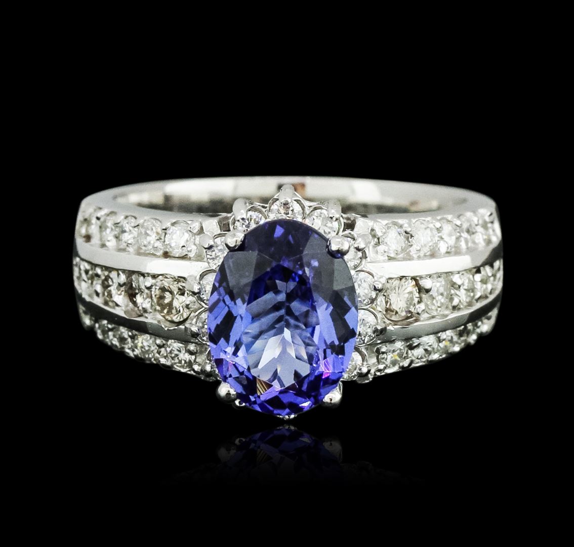 One electronically tested 14KT white gold ladies cast tanzanite and diamond ring with a bright polish finish. Identified with markings of "K14". Condition is new. Containing: One prong set oval modified brilliant cut natural tanzanite, measuring 9.90 x 7.40 x 4.81mm, approximate weight of 2.48ct., clarity is eye clean, type I, medium light, very slightly grayish, violet color, (GIA V 4/3), cut is good. Forty-Four prong set round brilliant cut diamonds, measuring 2.20 - 1.50 x 1.11mm (depth est.) approximate total weight of 44 Stones = 0.80ct. Clarity: SI-2 to I-1. Color: I - K, Cut is Good. Colored gemstones are presumed to have been subjected to commonly used enhancement processes. All diamonds and colored gemstones are graded in the mounting, unless otherwise stated. Total Weight of Colored Stones 2.48ct. Total Weight of Diamonds 0.80ct. Total Weight of Ring 8.30 grams. GGL Appraised at $5,575.00.