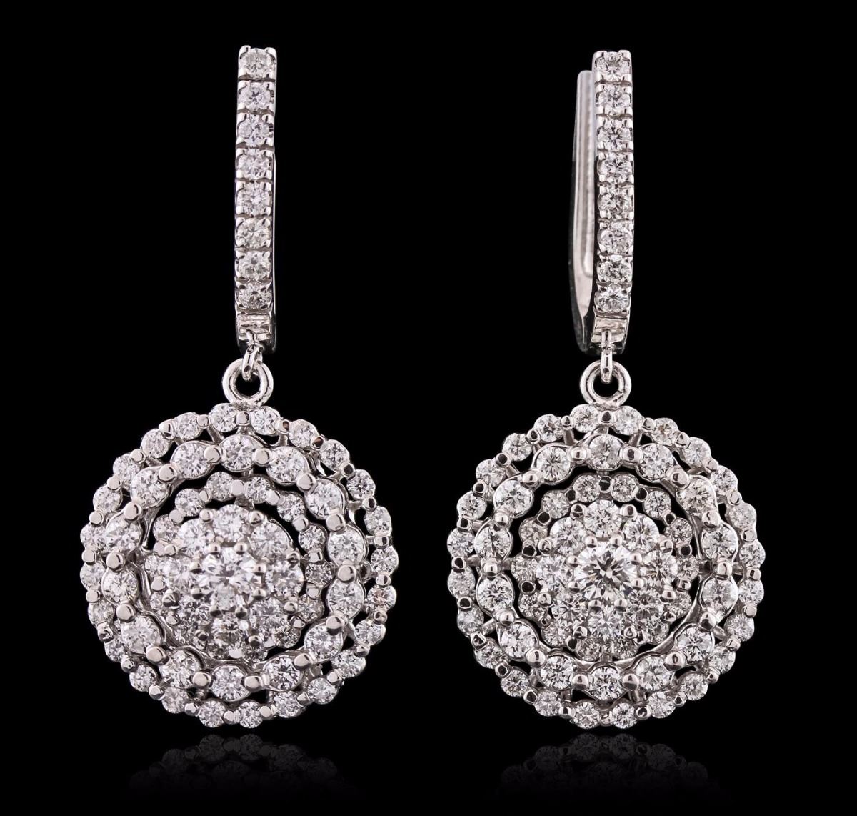One pair electronically tested 14KT white gold ladies combination cast & assembled dangle earrings with hinged clip backs with a bright polish finish. Identified with markings of "14K". Condition is new. Containing: Two prong set round brilliant cut diamonds, measuring 3.50 - 3.50 x 2.10mm (depth est.) approximate total weight of 2 Stones = 0.31ct. Clarity: SI-1 to SI-2. Color: G - H, Cut is Good. One Hundred Thirty-Two prong set round brilliant cut diamonds, measuring 2.00 - 1.30 x 0.99mm (depth est.) approximate total weight of 132 Stones = 2.17ct. Clarity: SI-1 to SI-2. Color: G - H, Cut is Good. All diamonds are graded in the mounting, unless otherwise stated. Total Weight of Diamonds 2.48ct. Total Weight of Earrings 11.60 grams. GGL Appraised at $12,915.00.