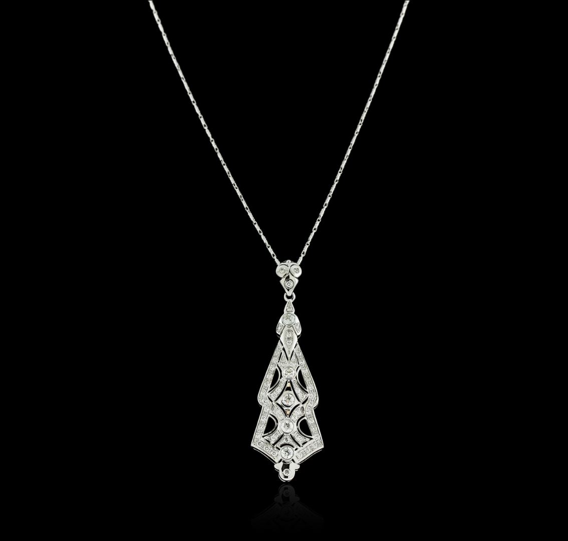 One electronically tested 14KT white gold ladies cast diamond pendant & chain 18.0" long, with a lobster claw clasp with a bright polish finish. Identified with markings of "14K". Condition is new. Containing: Five bezel set round brilliant cut diamonds, measuring 4.30 - 4.30 x 2.58mm (depth est.) approximate total weight of 5 Stones = 1.46ct. Clarity: I-1. Color: I - J, Cut is Good. Forty-Eight bezel set round brilliant cut diamonds, measuring 1.80 - 1.80 x 1.08mm (depth est.) approximate total weight of 48 Stones = 1.02ct. Clarity: SI-1 to SI-2. Color: I - K, Cut is Good. All diamonds are graded in the mounting, unless otherwise stated. Total Weight of Diamonds 2.48ct. Total Weight of Pendant & Chain 17.00 grams. GGL Appraised at $7,440.00.