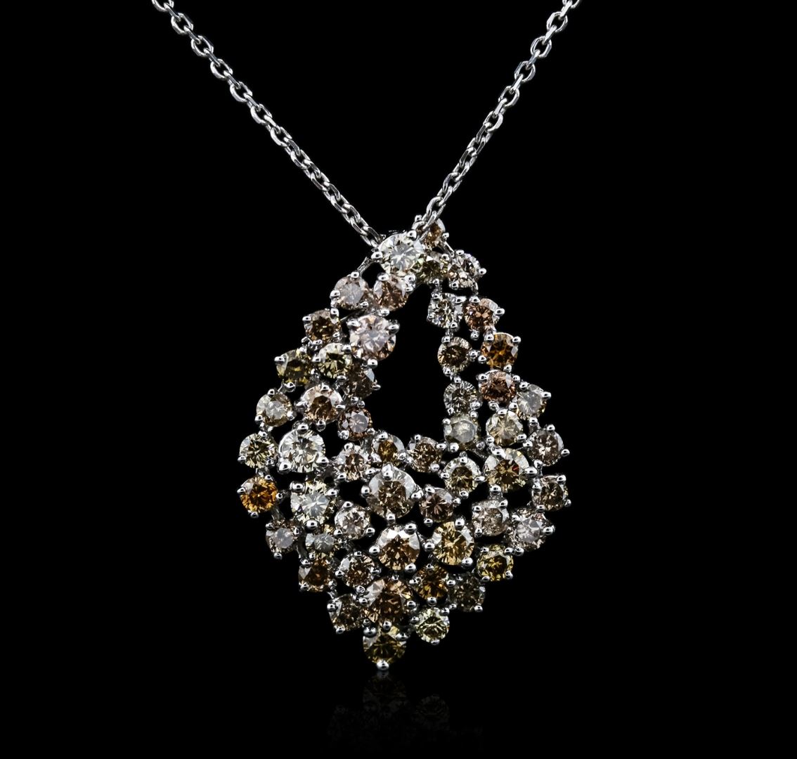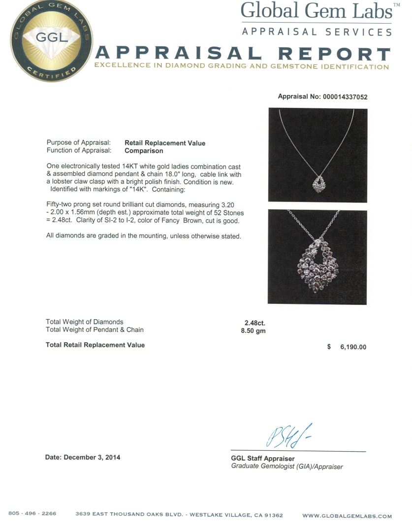 One electronically tested 14KT white gold ladies combination cast & assembled diamond pendant & chain 18.0" long, cable link with a lobster claw clasp with a bright polish finish. Identified with markings of "14K". Condition is new. Containing: Fifty-Two prong set round brilliant cut diamonds, measuring 3.20 - 2.00. x 1.56mm (depth est.) approximate total weight of 52 Stones = 2.48ct. Clarity: SI-2 to I-2, Cut is Good. All diamonds are graded in the mounting, unless otherwise stated. Total Weight of Diamonds 2.48ct. Total Weight of Pendant & Chain 8.50 grams. GGL Appraised at $6,190.00.