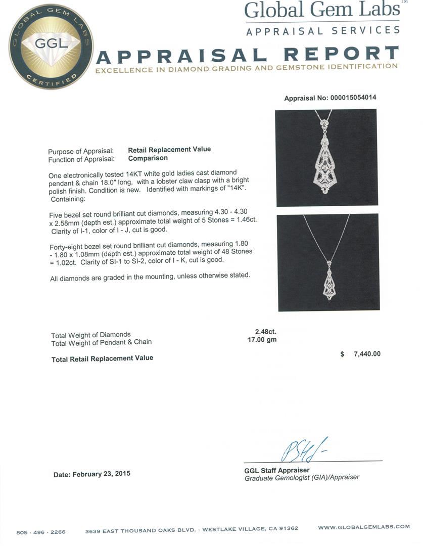 One electronically tested 14KT white gold ladies cast diamond pendant & chain 18.0" long, with a lobster claw clasp with a bright polish finish. Identified with markings of "14K". Condition is new. Containing: Five bezel set round brilliant cut diamonds, measuring 4.30 - 4.30 x 2.58mm (depth est.) approximate total weight of 5 Stones = 1.46ct. Clarity: I-1. Color: I - J, Cut is Good. Forty-Eight bezel set round brilliant cut diamonds, measuring 1.80 - 1.80 x 1.08mm (depth est.) approximate total weight of 48 Stones = 1.02ct. Clarity: SI-1 to SI-2. Color: I - K, Cut is Good. All diamonds are graded in the mounting, unless otherwise stated. Total Weight of Diamonds 2.48ct. Total Weight of Pendant & Chain 17.00 grams. GGL Appraised at $7,440.00.