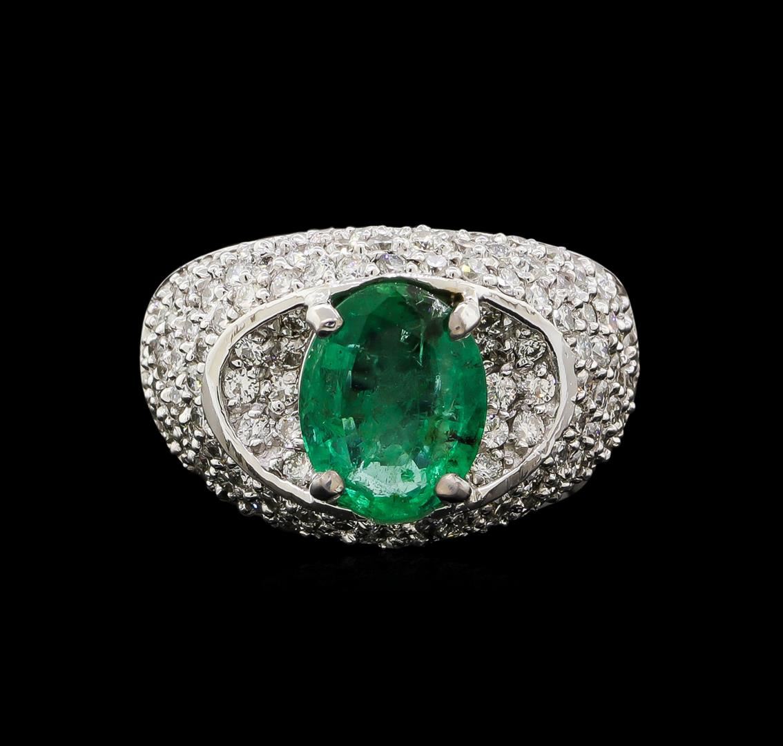 One electronically tested 14KT white gold ladies cast emerald and diamond ring with a bright polish finish. Identified with markings of "K14". Condition is new. Containing: One prong set oval modified brilliant cut natural emerald, measuring 10.50 x 8.00 x 5.20mm, approximate weight of 2.50 ct., clarity is moderately included, type III, medium light, very slightly grayish, green color, (GIA G 4/3), cut is good. One Hundred Eight prong set round brilliant cut diamonds, measuring 1.50 - 1.50 x 0.90mm (depth est.) approximate total weight of 108 Stones = 1.33ct. Clarity: SI-1 to I-1. Color: H - I. Colored gemstones are presumed to have been subjected to commonly used enhancement processes. All diamonds and colored gemstones are graded in the mounting, unless otherwise stated. Total Weight of Colored Stones 2.50 ct. Total Weight of Diamonds 1.33ct. Total Weight of Ring 8.90 grams. GGL Appraised.