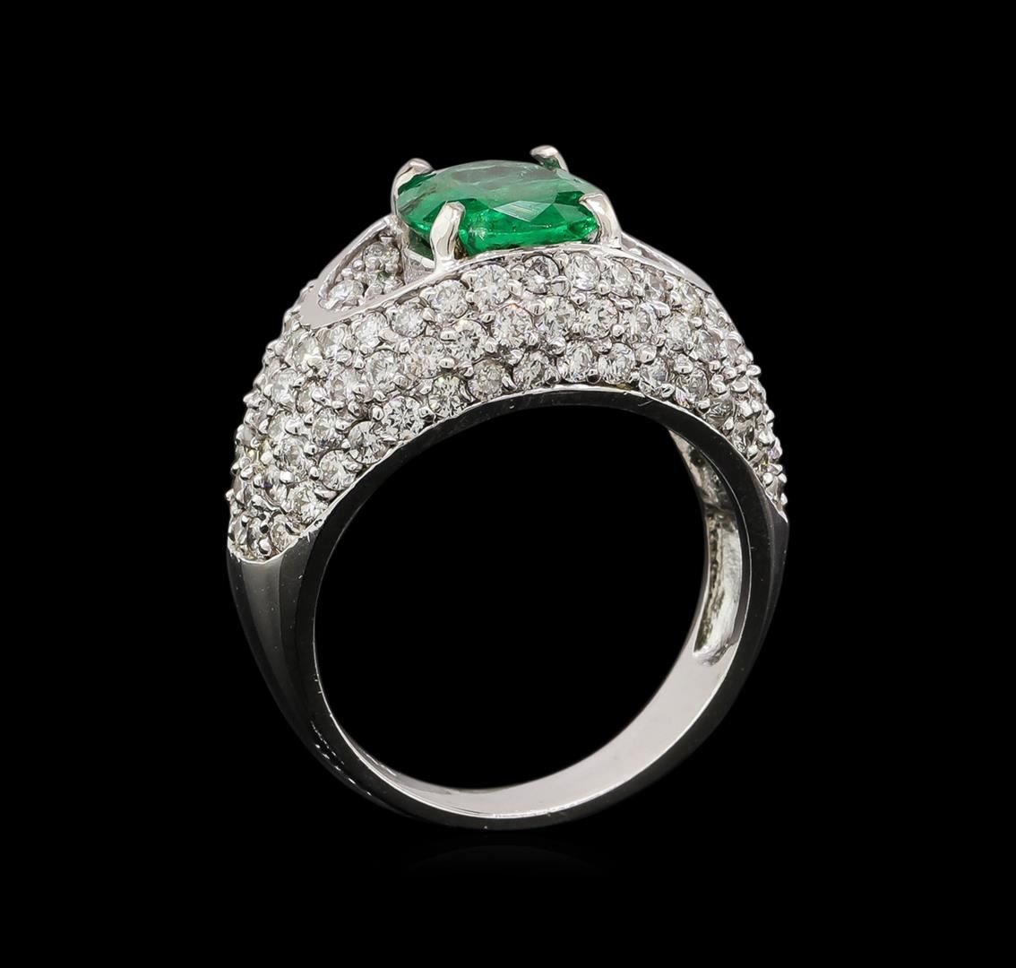 One electronically tested 14KT white gold ladies cast emerald and diamond ring with a bright polish finish. Identified with markings of "K14". Condition is new. Containing: One prong set oval modified brilliant cut natural emerald, measuring 10.50 x 8.00 x 5.20mm, approximate weight of 2.50 ct., clarity is moderately included, type III, medium light, very slightly grayish, green color, (GIA G 4/3), cut is good. One Hundred Eight prong set round brilliant cut diamonds, measuring 1.50 - 1.50 x 0.90mm (depth est.) approximate total weight of 108 Stones = 1.33ct. Clarity: SI-1 to I-1. Color: H - I. Colored gemstones are presumed to have been subjected to commonly used enhancement processes. All diamonds and colored gemstones are graded in the mounting, unless otherwise stated. Total Weight of Colored Stones 2.50 ct. Total Weight of Diamonds 1.33ct. Total Weight of Ring 8.90 grams. GGL Appraised.