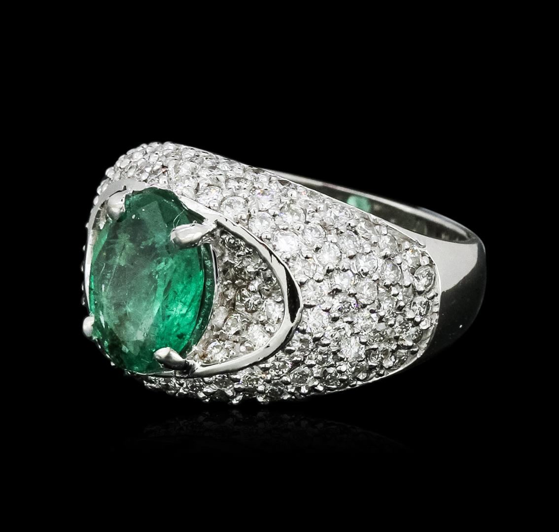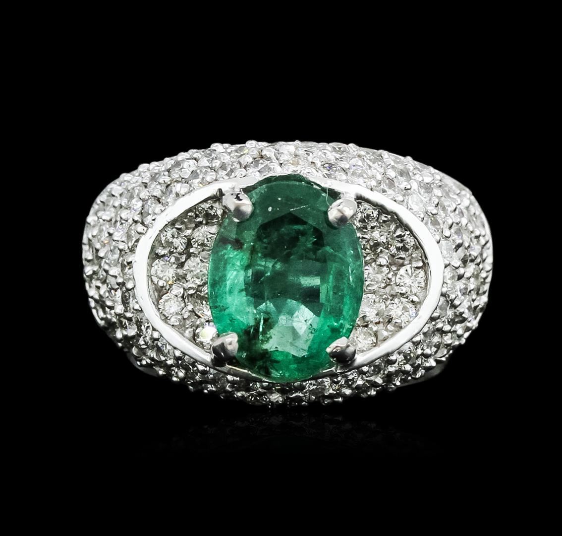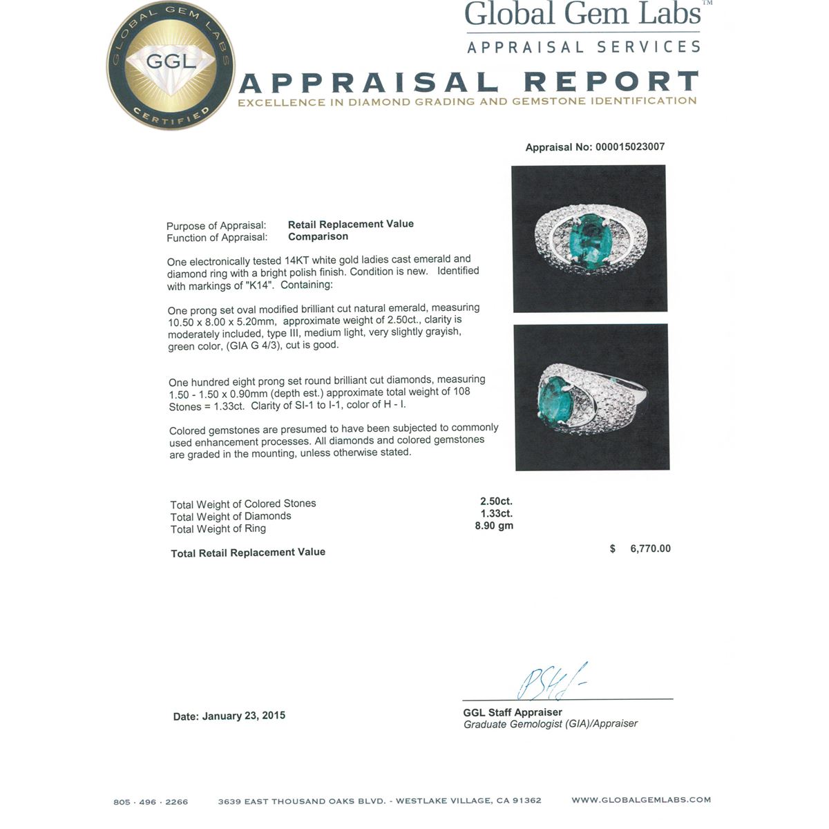 One electronically tested 14KT white gold ladies cast emerald and diamond ring with a bright polish finish. Identified with markings of "K14". Condition is new. Containing: One prong set oval modified brilliant cut natural emerald, measuring 10.50 x 8.00 x 5.20mm, approximate weight of 2.50ct., clarity is moderately included, type III, medium light, very slightly grayish, green color, (GIA G 4/3), cut is good. One Hundred Eight prong set round brilliant cut diamonds, measuring 1.50 - 1.50 x 0.90mm (depth est.) approximate total weight of 108 Stones = 1.33ct. Clarity: SI-1 to I-1. Color: H - I. Colored gemstones are presumed to have been subjected to commonly used enhancement processes. All diamonds and colored gemstones are graded in the mounting, unless otherwise stated. Total Weight of Colored Stones 2.50ct. Total Weight of Diamonds 1.33ct. Total Weight of Ring 8.90 grams. GGL Appraised at $6,770.00.