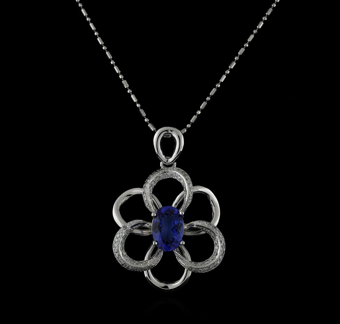 One electronically tested 14KT white gold ladies cast tanzanite and diamond pendant & chain 18.0" long, with a spring ring clasp with a bright polish finish. Identified with markings of "14K". Condition is new. Containing: One prong set oval oval modified brilliant cut natural tanzanite, measuring 10.50 x 6.50 x 4.23mm, approximate weight of 2.50ct., clarity is eye clean, type I, medium light, very slightly grayish, violet color, (GIA V 4/3), cut is good. Seventy-Two prong set round brilliant cut diamonds, measuring 1.30 - 1.30 x 0.78mm (depth est.) approximate total weight of 72 Stones = 0.50ct. Clarity: SI-1 to I-1. Color: H - I, Cut is Good. Colored gemstones are presumed to have been subjected to commonly used enhancement processes. All diamonds and colored gemstones are graded in the mounting, unless otherwise stated. Total Weight of Colored Stones 2.50ct. Total Weight of Diamonds 0.50ct. Total Weight of Pendant & Chain 10.00 grams. GGL Appraised at $4,070.00.