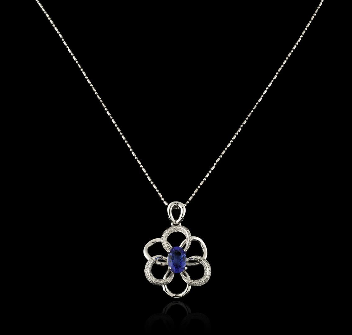 One electronically tested 14KT white gold ladies cast tanzanite and diamond pendant & chain 18.0" long, with a spring ring clasp with a bright polish finish. Identified with markings of "14K". Condition is new. Containing: One prong set oval oval modified brilliant cut natural tanzanite, measuring 10.50 x 6.50 x 4.23mm, approximate weight of 2.50ct., clarity is eye clean, type I, medium light, very slightly grayish, violet color, (GIA V 4/3), cut is good. Seventy-Two prong set round brilliant cut diamonds, measuring 1.30 - 1.30 x 0.78mm (depth est.) approximate total weight of 72 Stones = 0.50ct. Clarity: SI-1 to I-1. Color: H - I, Cut is Good. Colored gemstones are presumed to have been subjected to commonly used enhancement processes. All diamonds and colored gemstones are graded in the mounting, unless otherwise stated. Total Weight of Colored Stones 2.50ct. Total Weight of Diamonds 0.50ct. Total Weight of Pendant & Chain 10.00 grams. GGL Appraised at $4,070.00.