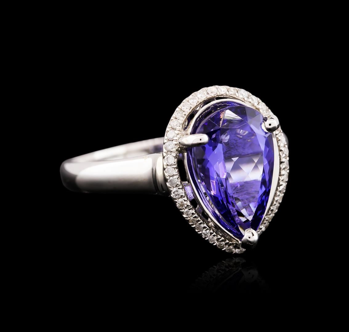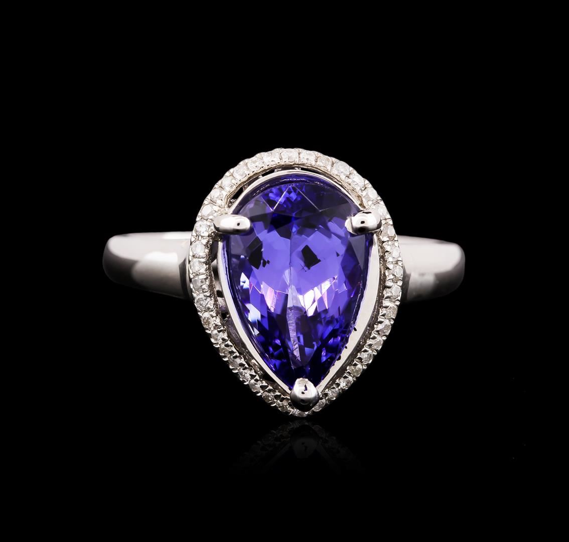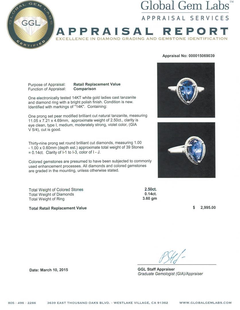 One electronically tested 14KT white gold ladies cast tanzanite and diamond ring with a bright polish finish. Identified with markings of "14K". Condition is new. Containing: One prong set pear modified brilliant cut natural tanzanite, measuring 11.05 x 7.21 x 4.69mm, approximate weight of 2.50ct., clarity is eye clean, type I, medium, moderately strong, violet color, (GIA V 5/4), cut is good. Thirty-Nine prong set round brilliant cut diamonds, measuring 1.00 - 1.00 x 0.60mm (depth est.) approximate total weight of 39 Stones = 0.14ct. Clarity: I-1 to I-3. Color: I - J. Colored gemstones are presumed to have been subjected to commonly used enhancement processes. All diamonds and colored gemstones are graded in the mounting, unless otherwise stated. Total Weight of Colored Stones 2.50ct. Total Weight of Diamonds 0.14ct. Total Weight of Ring 3.60 grams. GGL Appraised at $2,995.00.