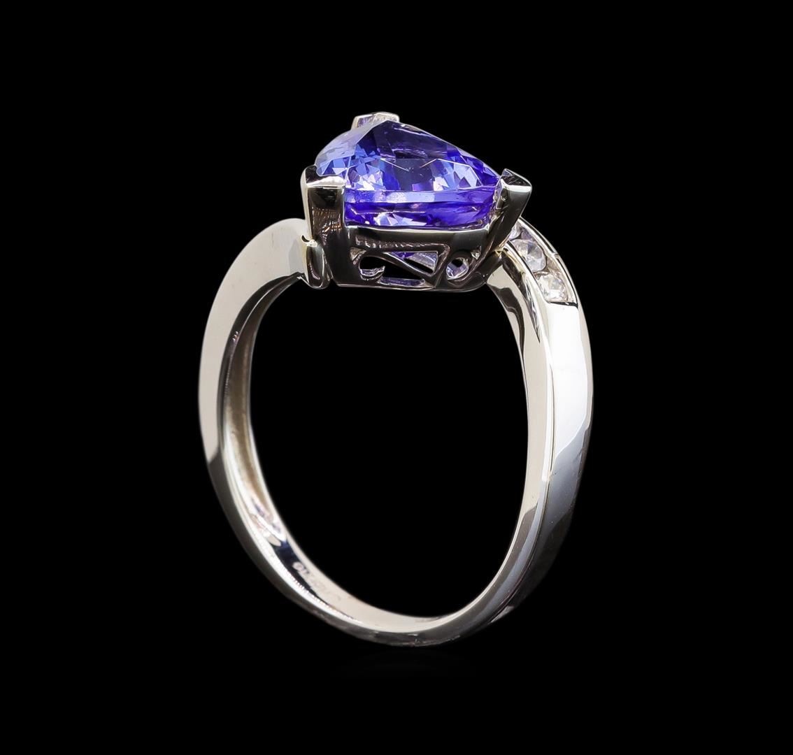 One electronically tested 14KT white gold ladies cast tanzanite and diamond ring with a flat shank with a bright polish finish. Trademark is Orianne. Identified with markings of "14K". Condition is new. Containing: One prong set triangle modified brilliant cut natural tanzanite, measuring 8.61 x 8.43 x 5.73mm, approximate weight of 2.51ct., clarity is eye clean, type I, medium, very slightly grayish, violet color, (GIA V 5/3), cut is good. Six channel set round brilliant cut diamonds, measuring 1.50 - 1.50 x 0.90mm (depth est.) approximate total weight of 6 Stones = 0.07ct. Clarity: SI-2 to I-1. Color: I - J, Cut is Good. All diamonds and colored gemstones are graded in the mounting, unless otherwise stated. Colored gemstones are presumed to have been subjected to commonly used enhancement processes.. Total Weight of Colored Stones 2.51ct. Total Weight of Diamonds 0.07ct. Total Weight of Ring 3.90 grams. GGL Appraised at $2,775.00.
