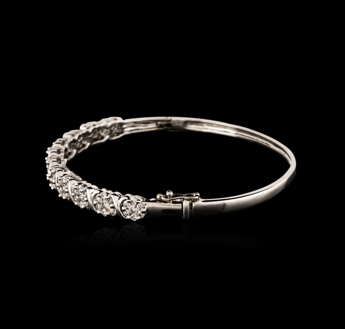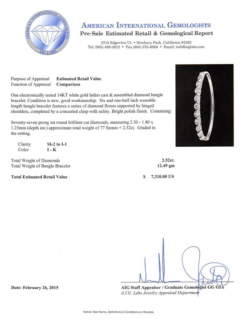 One electronically tested 14KT white gold ladies cast & assembled diamond bangle bracelet. Six and one-half inch wearable length bangle bracelet features a series of diamond florets supported by hinged shoulders, completed by a concealed clasp with safety. Bright polish finish. Condition is new, good workmanship. Containing: Seventy-Seven prong set round brilliant cut diamonds, measuring 2.30 - 1.80 x 1.23mm (depth est.) approximate total weight of 77 Stones = 2.52ct. Graded in the setting. Clarity: SI-2 to I-1. Color: I - K. Total Weight of Diamonds 2.52ct. Total Weight of Bangle Bracelet 12.49 grams. AIG Appraised at $7,310.00.