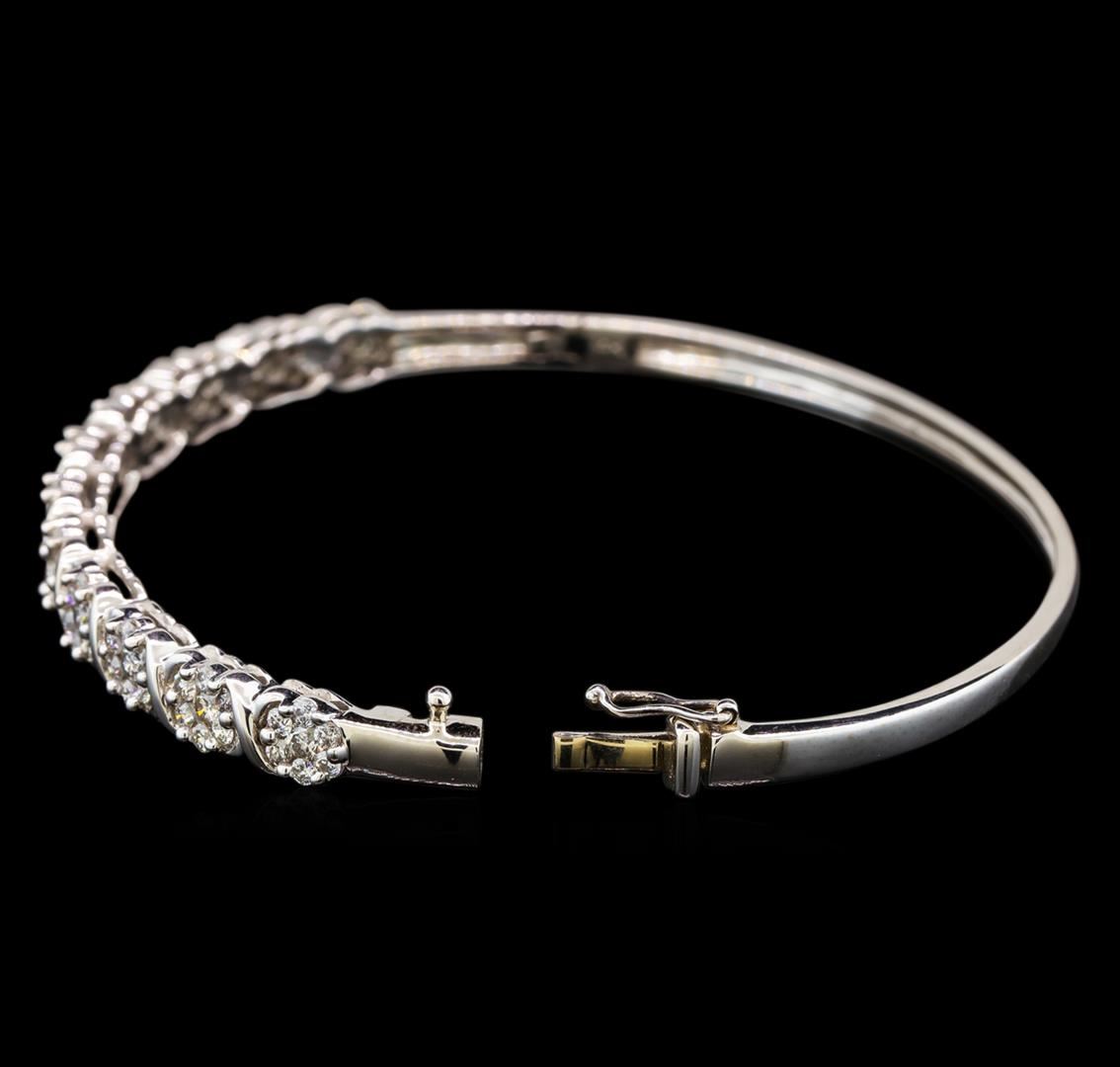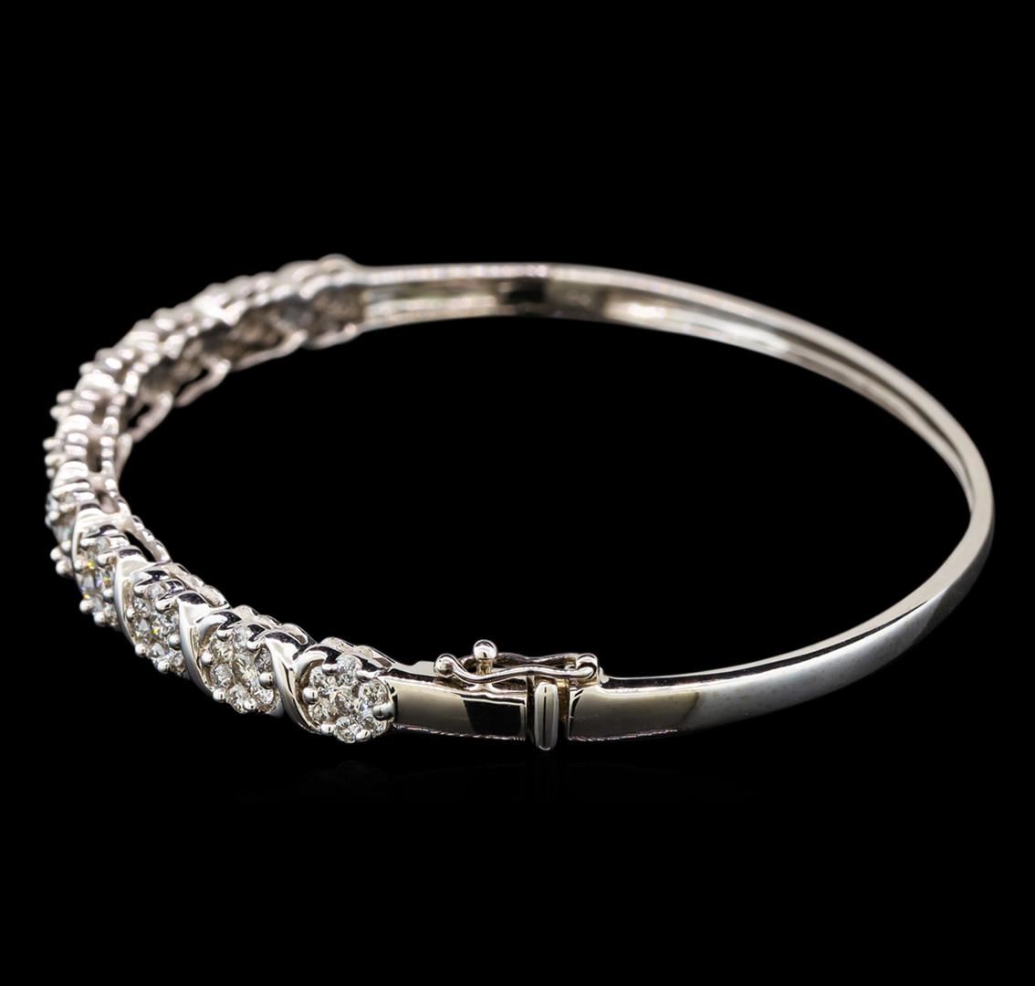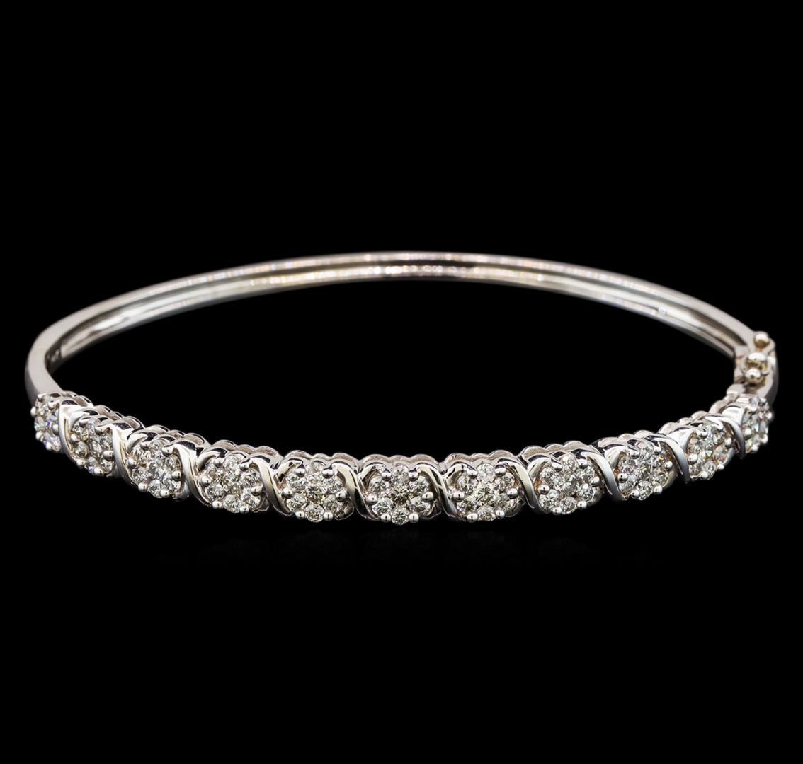 One electronically tested 14KT white gold ladies cast & assembled diamond bangle bracelet. Six and one-half inch wearable length bangle bracelet features a series of diamond florets supported by hinged shoulders, completed by a concealed clasp with safety. Bright polish finish. Condition is new, good workmanship. Containing: Seventy-Seven prong set round brilliant cut diamonds, measuring 2.30 - 1.80 x 1.23mm (depth est.) approximate total weight of 77 Stones = 2.52ct. Graded in the setting. Clarity: SI-2 to I-1. Color: I - K. Total Weight of Diamonds 2.52ct. Total Weight of Bangle Bracelet 12.49 grams. AIG Appraised at $7,310.00.