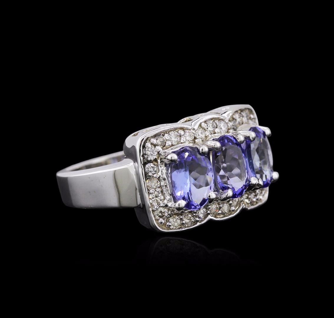 One electronically tested 14KT white gold ladies cast tanzanite and diamond three stone ring with a tapered shank with a bright polish finish. Identified with markings of "K14". Condition is new. Containing: Three prong set oval modified brilliant cut natural tanzanites, measuring 7.05 x 5.20 x 3.24mm, approximate total weight of 2.52ct., clarity is eye clean, type I, medium light, very slightly grayish, violet color, (GIA V 4/3), cut is good. Twenty-Eight prong set round brilliant cut diamonds, measuring 1.50 - 1.50 x 0.90mm (depth est.) approximate total weight of 28 Stones = 0.34ct. Clarity: SI-2 to I-1. Color: H - I, Cut is Good. Colored gemstones are presumed to have been subjected to commonly used enhancement processes. Diamonds and colored gemstones are graded in the mounting, unless otherwise stated. Total Weight of Colored Stones 2.52ct. Total Weight of Diamonds 0.34ct. Total Weight of Three Stone Ring 7.50 grams. GGL Appraised at $3,635.00.