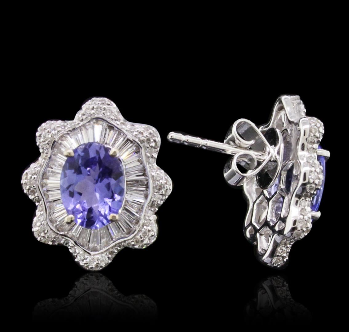 One pair electronically tested 14KT white gold ladies combination cast & assembled stud earrings with friction posts with a bright polish finish. Identified with markings of "14K". Condition is new. Containing: Two prong set oval modified brilliant cut natural tanzanites, measuring 8.00 x 5.94 x 3.86mm, approximate total weight of 2.52ct., clarity is eye clean, type I, medium light, very slightly grayish, violet color, (GIA V 4/3), cut is good. Two Hundred Twenty-Four prong set round brilliant cut diamonds, measuring 1.00. - 1.00 x 0.60mm (depth est.) approximate total weight of 224 Stones = 0.81ct. Clarity: I-1 to I-2. Color: I - J, Cut is Good. Sixty channel set baguette cut diamonds, measuring from 1.50 x 1.10 x 0.94mm (depth est.) to 2.00 x 1.10 x 0.94mm (depth est.) approximate total weight of 60 Stones = 0.99ct. Clarity: SI-1. Color: I - J, Cut is Good. Colored gemstones are presumed to have been subjected to commonly used enhancement processes. All diamonds and colored gemstones are graded in the mounting, unless otherwise stated. Total Weight of Colored Stones 2.52ct. Total Weight of Diamonds 1.80ct. Total Weight of Earrings 5.00. grams. GGL Appraised at $8,850.00.