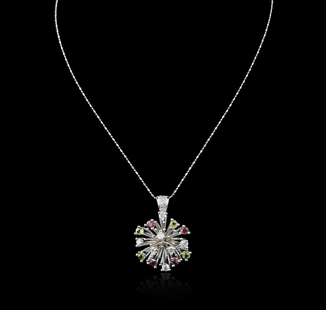 One electronically tested 14KT white gold ladies cast tourmaline and diamond pendant & chain 18.0" long, with a spring ring clasp with a bright polish finish. Identified with markings of "585". Condition is new. Containing: Four prong set round modified brilliant cut natural pink tourmalines, measuring 4.70 - 4.70 x 3.06 mm, approximate total weight of 1.27ct., clarity is eye clean, type II, medium light, very slightly grayish, pink color, (GIA rP 4/3), cut is good. Four prong set round modified brilliant cut natural green tourmalines, measuring 4.70 - 4.70 x 3.06 mm, approximate total weight of 1.25ct., clarity is eye clean, type I, medium light, very slightly grayish, green color, (GIA G 4/3), cut is good. Seven prong set round brilliant cut diamonds, measuring 3.80 - 3.80 x 2.28mm (depth est.) approximate total weight of 7 Stones = 1.49ct. Clarity: SI-2. Color: H - I, Cut is Good. Sixteen prong set round brilliant cut diamonds, measuring 1.50 - 1.50 x 0.90mm (depth est.) approximate total weight of 16 Stones = 0.16ct. Clarity: SI-1 to SI-2. Color: G - H, Cut is Good. Colored gemstones are presumed to have been subjected to commonly used enhancement processes. All diamonds and colored gemstones are graded in the mounting, unless otherwise stated. Total Weight of Colored Stones 2.52ct. Total Weight of Diamonds 1.65ct. Total Weight of Pendant & Chain 13.00 grams. GGL Appraised at $5,585.00.