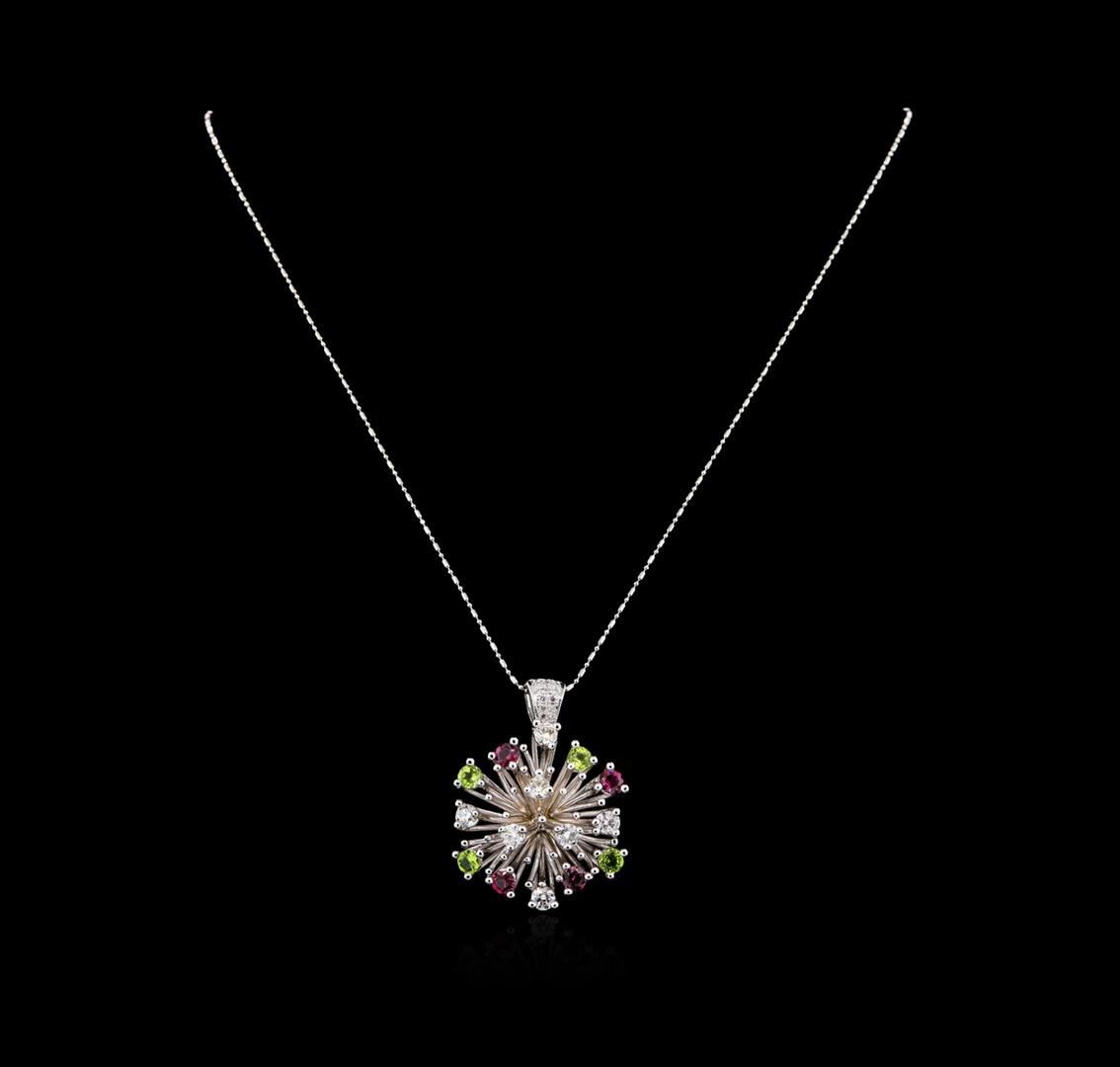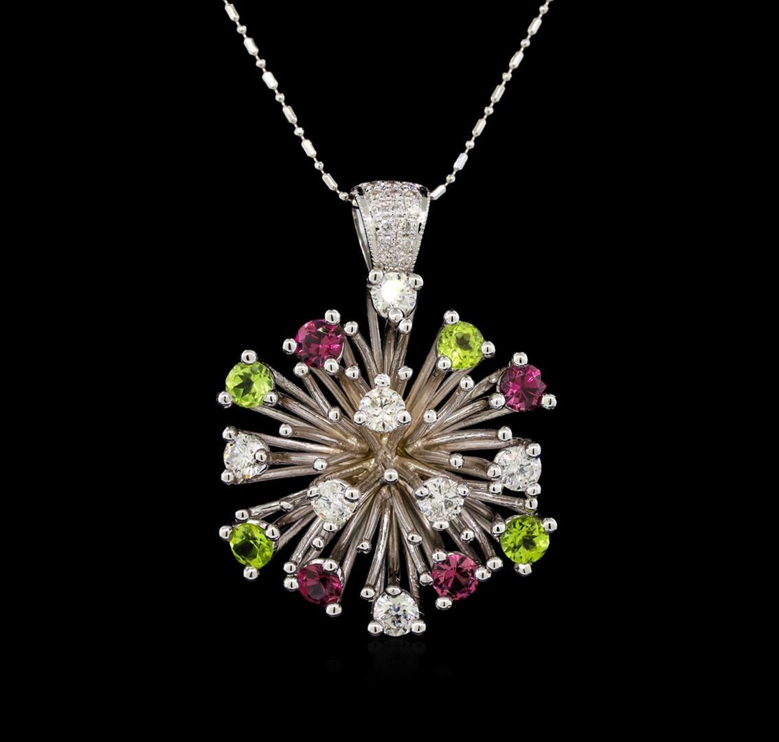One electronically tested 14KT white gold ladies cast tourmaline and diamond pendant & chain 18.0" long, with a spring ring clasp with a bright polish finish. Identified with markings of "585". Condition is new. Containing: Four prong set round modified brilliant cut natural pink tourmalines, measuring 4.70 - 4.70 x 3.06 mm, approximate total weight of 1.27ct., clarity is eye clean, type II, medium light, very slightly grayish, pink color, (GIA rP 4/3), cut is good. Four prong set round modified brilliant cut natural green tourmalines, measuring 4.70 - 4.70 x 3.06 mm, approximate total weight of 1.25ct., clarity is eye clean, type I, medium light, very slightly grayish, green color, (GIA G 4/3), cut is good. Seven prong set round brilliant cut diamonds, measuring 3.80 - 3.80 x 2.28mm (depth est.) approximate total weight of 7 Stones = 1.49ct. Clarity: SI-2. Color: H - I, Cut is Good. Sixteen prong set round brilliant cut diamonds, measuring 1.50 - 1.50 x 0.90mm (depth est.) approximate total weight of 16 Stones = 0.16ct. Clarity: SI-1 to SI-2. Color: G - H, Cut is Good. Colored gemstones are presumed to have been subjected to commonly used enhancement processes. All diamonds and colored gemstones are graded in the mounting, unless otherwise stated. Total Weight of Colored Stones 2.52ct. Total Weight of Diamonds 1.65ct. Total Weight of Pendant & Chain 13.00 grams. GGL Appraised.