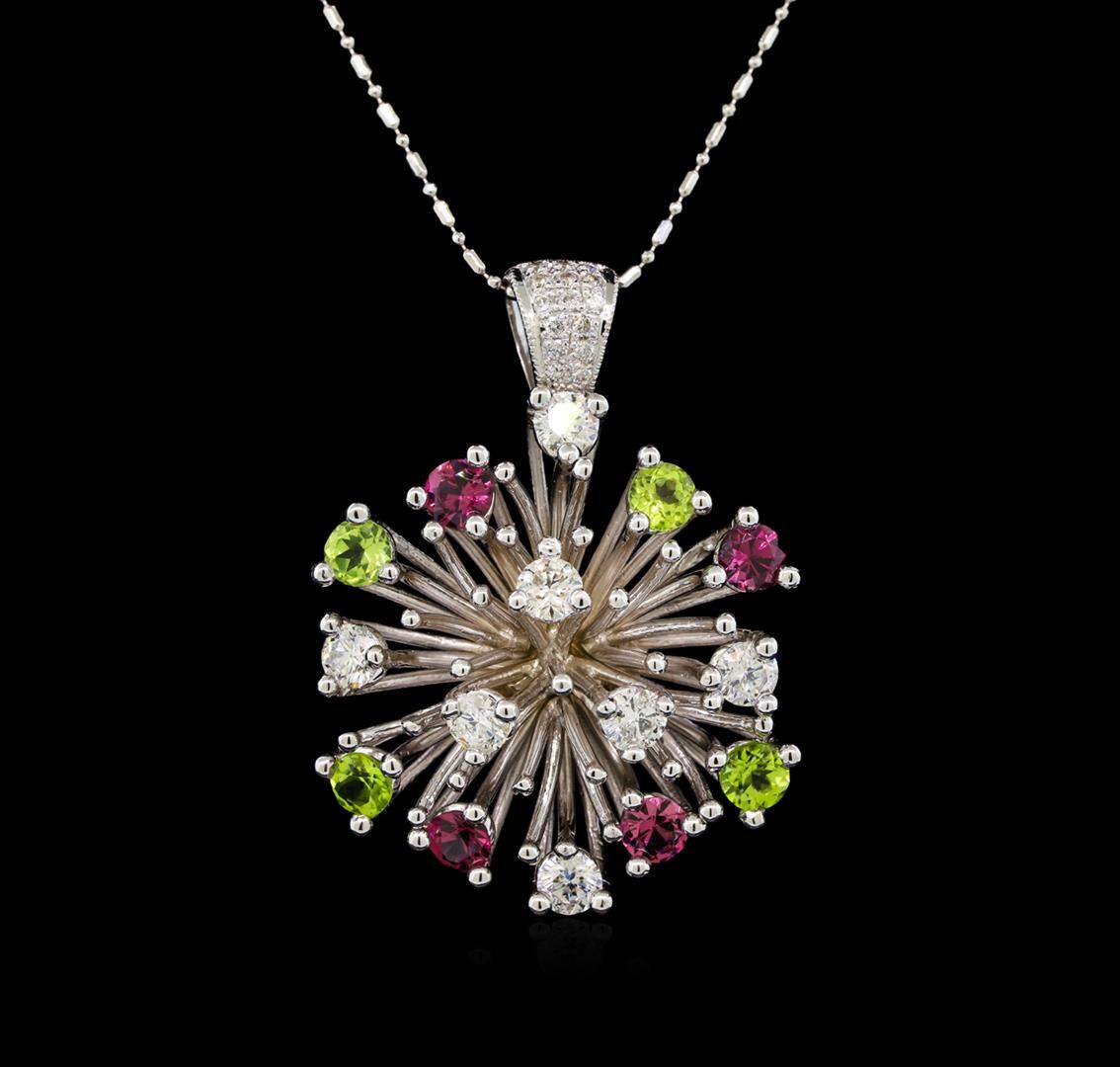 One electronically tested 14KT white gold ladies cast tourmaline and diamond pendant & chain 18.0" long, with a spring ring clasp with a bright polish finish. Identified with markings of "585". Condition is new. Containing: Four prong set round modified brilliant cut natural pink tourmalines, measuring 4.70 - 4.70 x 3.06 mm, approximate total weight of 1.27ct., clarity is eye clean, type II, medium light, very slightly grayish, pink color, (GIA rP 4/3), cut is good. Four prong set round modified brilliant cut natural green tourmalines, measuring 4.70 - 4.70 x 3.06 mm, approximate total weight of 1.25ct., clarity is eye clean, type I, medium light, very slightly grayish, green color, (GIA G 4/3), cut is good. Seven prong set round brilliant cut diamonds, measuring 3.80 - 3.80 x 2.28mm (depth est.) approximate total weight of 7 Stones = 1.49ct. Clarity: SI-2. Color: H - I, Cut is Good. Sixteen prong set round brilliant cut diamonds, measuring 1.50 - 1.50 x 0.90mm (depth est.) approximate total weight of 16 Stones = 0.16ct. Clarity: SI-1 to SI-2. Color: G - H, Cut is Good. Colored gemstones are presumed to have been subjected to commonly used enhancement processes. All diamonds and colored gemstones are graded in the mounting, unless otherwise stated. Total Weight of Colored Stones 2.52ct. Total Weight of Diamonds 1.65ct. Total Weight of Pendant & Chain 13.00 grams. GGL Appraised.
