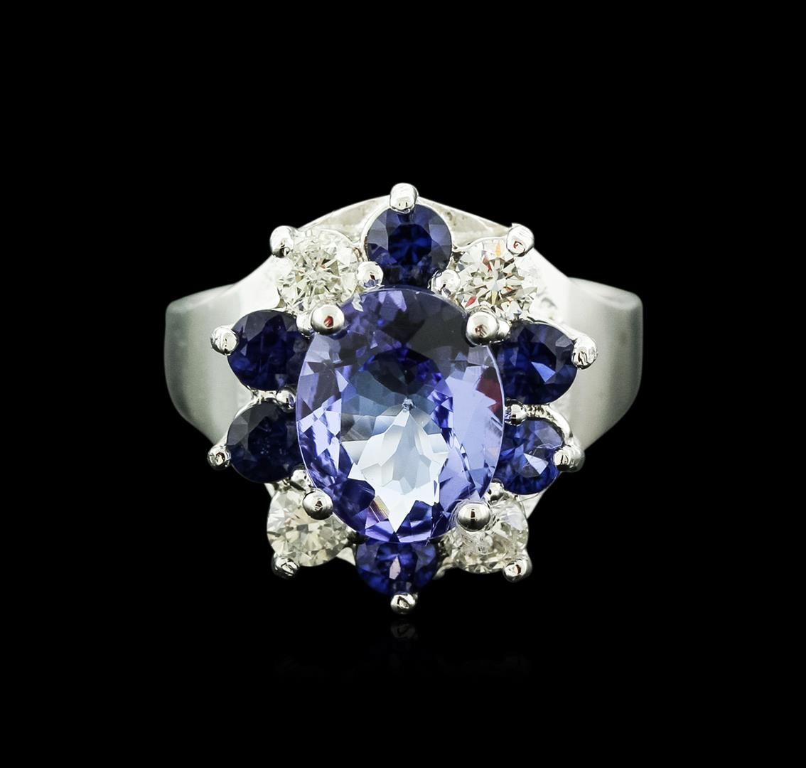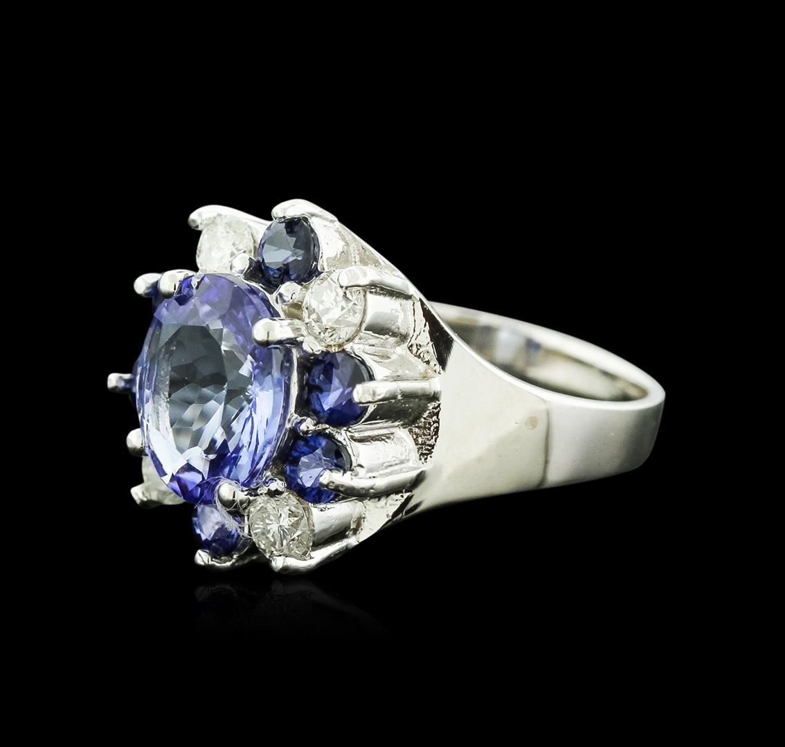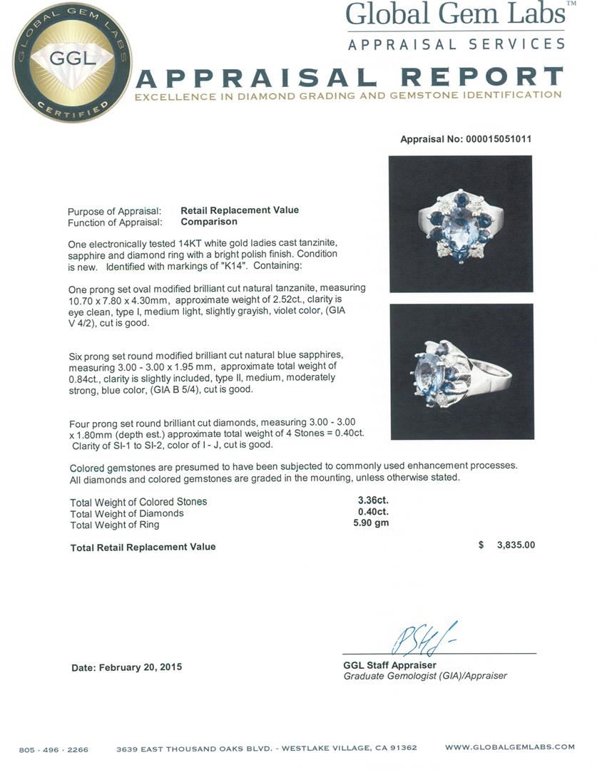 One electronically tested 14KT white gold ladies cast tanzanite, sapphire and diamond ring with a bright polish finish. Identified with markings of "K14". Condition is new. Containing: One prong set oval modified brilliant cut natural tanzanite, measuring 10.70 x 7.80 x 4.30mm, approximate weight of 2.52ct., clarity is eye clean, type I, medium light, slightly grayish, violet color, (GIA V 4/2), cut is good. Six prong set round modified brilliant cut natural blue sapphires, measuring 3.00 - 3.00 x 1.95 mm, approximate total weight of 0.84ct., clarity is slightly included, type II, medium, moderately strong, blue color, (GIA B 5/4), cut is good. Four prong set round brilliant cut diamonds, measuring 3.00 - 3.00 x 1.80mm (depth est.) approximate total weight of 4 Stones = 0.40ct. Clarity: SI-1 to SI-2. Color: I - J, Cut is Good. Colored gemstones are presumed to have been subjected to commonly used enhancement processes. All diamonds and colored gemstones are graded in the mounting, unless otherwise stated. Total Weight of Colored Stones 3.36ct. Total Weight of Diamonds 0.40ct. Total Weight of Ring 5.90 grams. GGL Appraised at $3,835.00.