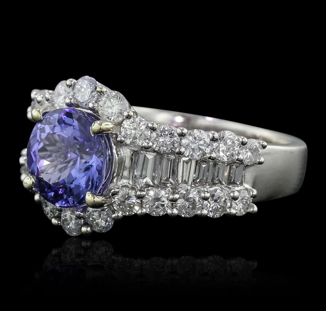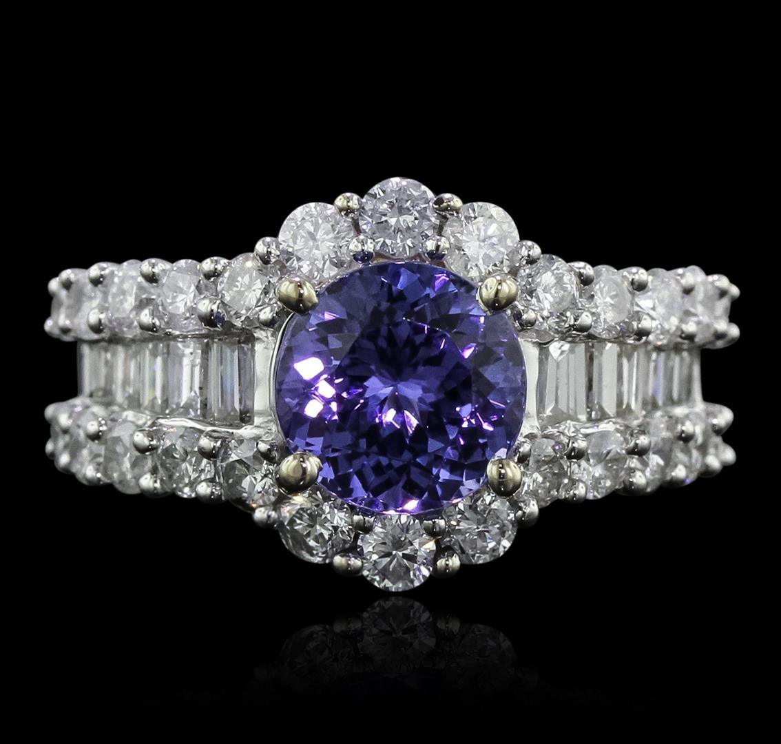 One electronically tested 14KT white gold ladies cast tanzanite and diamond ring with a bright polish finish. Condition is new, good workmanship. The featured tanzanite is set within mirroring diamond ribbons supported by diamond set shoulders, completed by a three millimeter wide band. Trademark is Orianne. Identified with markings of "14K". Containing: One prong set round brilliant cut natural tanzanite, measuring 8.10 - 8.00 x 5.40 mm, 6%. bulge factor, approximate weight of 2.52ct., clarity is eye clean, type I, medium dark, very slightly grayish, bluish violet color, (GIA bV 6/3), cut is good. Transmitting light with no distortion, transparent. Graded in the setting. Tanzanite is a very rare gemstone that is only found in the country of Tanzania. Originally discovered in 1967. Tiffany & Company, named the stone Tanzanite. It is found in the Usumburu Mountains that border the Umba Valley of northern Tanzania. Tanzanite occurs in gray, brown, violet, blue, reddish-purple, & green. The gem is interesting because of its exceptional pleochroism. Rotated in different directions a tanzanite will exhibit multiple changes of color. Tanzanite has a low tolerance to ultrasonic cleaning, and should not be cleaned using this method. Twenty-Six prong set round brilliant cut diamonds, measuring 2.60 - 2.30 x 1.47mm (depth est.) approximate. Total Weight of 26 Stones = 1.50ct. Graded in the setting. Clarity: SI-1 to I-1 . Color: G - I Twelve channel set baguette cut diamonds, measuring from 2.10 x 1.50 x 1.05mm (depth est.) to 3.20 x 1.80 x 1.26mm (depth est.) approximate. Total Weight of 12 Stones = 0.55ct. Graded in the setting. Clarity: VS-1 to SI-1 . Color: G - I. Total Weight of Colored Stones 2.52ct.. Total Weight of Diamonds 2.05ct.. Total Weight of Ring 6.67gm. AIG Appraised at $12,960.00.