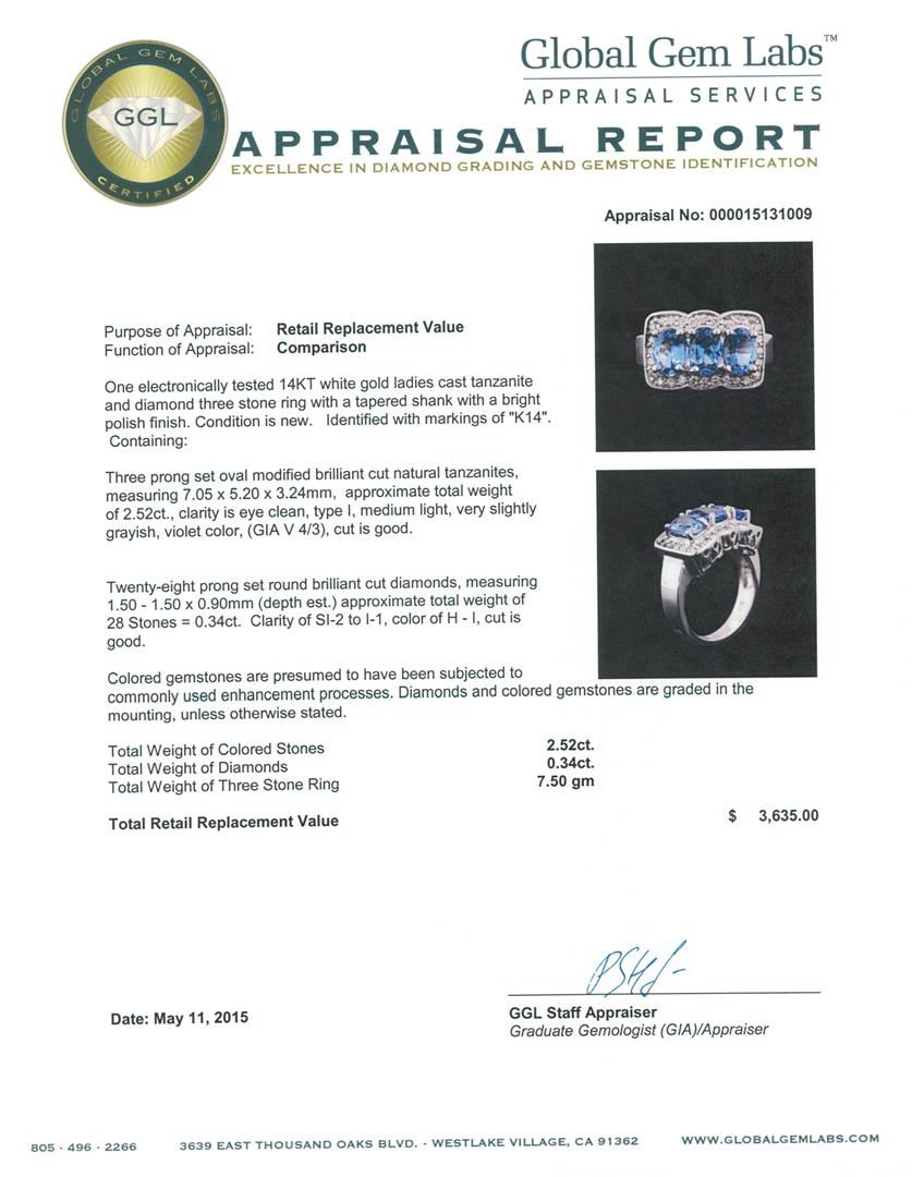 One electronically tested 14KT white gold ladies cast tanzanite and diamond three stone ring with a tapered shank with a bright polish finish. Identified with markings of "K14". Condition is new. Containing: Three prong set oval modified brilliant cut natural tanzanites, measuring 7.05 x 5.20 x 3.24mm, approximate total weight of 2.52ct., clarity is eye clean, type I, medium light, very slightly grayish, violet color, (GIA V 4/3), cut is good. Twenty-Eight prong set round brilliant cut diamonds, measuring 1.50 - 1.50 x 0.90mm (depth est.) approximate total weight of 28 Stones = 0.34ct. Clarity: SI-2 to I-1. Color: H - I, Cut is Good. Colored gemstones are presumed to have been subjected to commonly used enhancement processes. Diamonds and colored gemstones are graded in the mounting, unless otherwise stated. Total Weight of Colored Stones 2.52ct. Total Weight of Diamonds 0.34ct. Total Weight of Three Stone Ring 7.50 grams. GGL Appraised at $3,635.00.