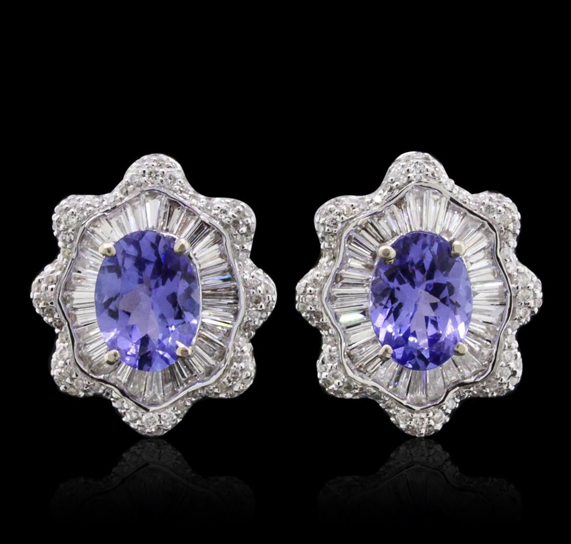 One pair electronically tested 14KT white gold ladies combination cast & assembled stud earrings with friction posts with a bright polish finish. Identified with markings of "14K". Condition is new. Containing: Two prong set oval modified brilliant cut natural tanzanites, measuring 8.00 x 5.94 x 3.86mm, approximate total weight of 2.52ct., clarity is eye clean, type I, medium light, very slightly grayish, violet color, (GIA V 4/3), cut is good. Two Hundred Twenty-Four prong set round brilliant cut diamonds, measuring 1.00. - 1.00 x 0.60mm (depth est.) approximate total weight of 224 Stones = 0.81ct. Clarity: I-1 to I-2. Color: I - J, Cut is Good. Sixty channel set baguette cut diamonds, measuring from 1.50 x 1.10 x 0.94mm (depth est.) to 2.00 x 1.10 x 0.94mm (depth est.) approximate total weight of 60 Stones = 0.99ct. Clarity: SI-1. Color: I - J, Cut is Good. Colored gemstones are presumed to have been subjected to commonly used enhancement processes. All diamonds and colored gemstones are graded in the mounting, unless otherwise stated. Total Weight of Colored Stones 2.52ct. Total Weight of Diamonds 1.80ct. Total Weight of Earrings 5.00. grams. GGL Appraised at $8,850.00.