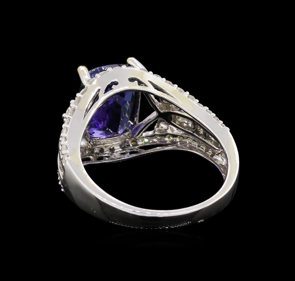 One electronically tested 14KT white gold ladies combination cast & assembled tanzanite and diamond ring with a split shank with a bright polish finish. Identified with markings of "14K". Condition is new. Containing: One prong set rectangular cushion modified brilliant cut natural tanzanite, measuring 9.78 x 7.24 x 4.53mm, approximate weight of 2.53ct., clarity is eye clean, type I, medium, very slightly grayish, violet color, (GIA V 5/3), cut is good. Sixty prong set round brilliant cut diamonds, measuring 1.80 - 1.40 x 0.96mm (depth est.) approximate total weight of 60 Stones = 0.89ct. Clarity: I-1 to I-3. Color: I - J, Cut is Good. Colored gemstones are presumed to have been subjected to commonly used enhancement processes. All diamonds and colored gemstones are graded in the mounting, unless otherwise stated. Total Weight of Colored Stones 2.53ct. Total Weight of Diamonds 0.89ct. Total Weight of Ring 4.80 grams. GGL Appraised at $6,665.00.