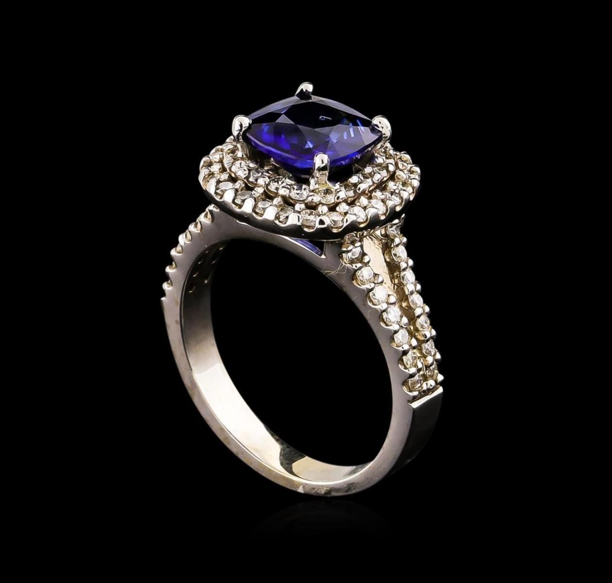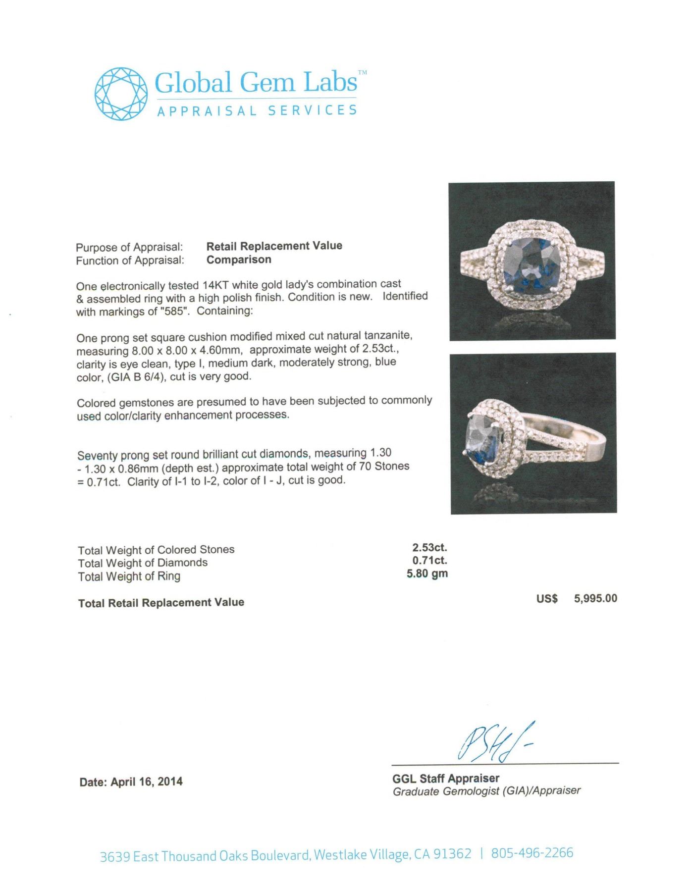 One electronically tested 14KT white gold Ladies combination cast & assembled ring with a high polish finish. Condition is new. Identified with markings of "585". Containing: One prong set square cushion modified mixed cut natural tanzanite, measuring 8.00 x 8.00 x 4.60mm, approximate weight of 2.53ct., clarity is eye clean, type I, medium dark, moderately strong, blue color, (GIA B 6/4), cut is very good. Colored gemstones are presumed to have been subjected to commonly used color/clarity enhancement processes. Seventy prong set round brilliant cut diamonds, measuring 1.30 - 1.30 x 0.86mm (depth est.) approximate. Total Weight of 70 Stones = 0.71ct. Clarity: I-1 to I-2. Color: I - J, Cut is Good. Total Weight of Colored Stones 2.53ct. Total Weight of Diamonds 0.71ct. Total Weight of Ring 5.80 grams. GGL Appraised.
