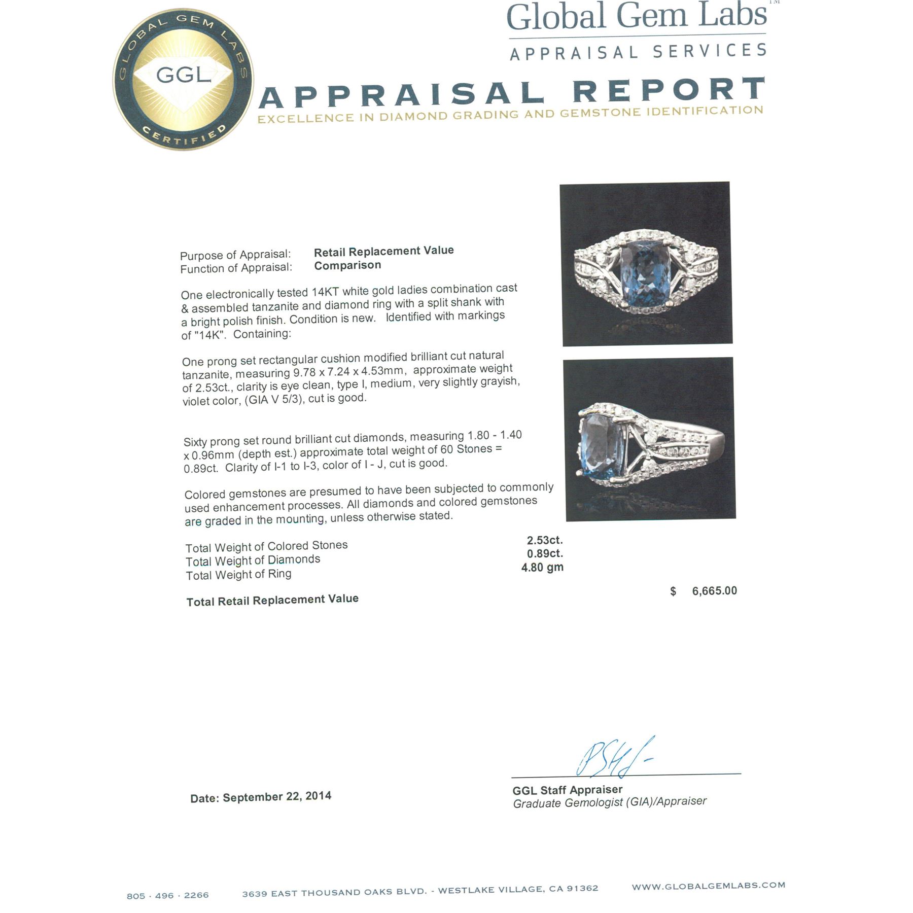 One electronically tested 14KT white gold ladies combination cast & assembled tanzanite and diamond ring with a split shank with a bright polish finish. Identified with markings of "14K". Condition is new. Containing: One prong set rectangular cushion modified brilliant cut natural tanzanite, measuring 9.78 x 7.24 x 4.53mm, approximate weight of 2.53ct., clarity is eye clean, type I, medium, very slightly grayish, violet color, (GIA V 5/3), cut is good. Sixty prong set round brilliant cut diamonds, measuring 1.80 - 1.40 x 0.96mm (depth est.) approximate total weight of 60 Stones = 0.89ct. Clarity: I-1 to I-3. Color: I - J, Cut is Good. Colored gemstones are presumed to have been subjected to commonly used enhancement processes. All diamonds and colored gemstones are graded in the mounting, unless otherwise stated. Total Weight of Colored Stones 2.53ct. Total Weight of Diamonds 0.89ct. Total Weight of Ring 4.80 grams. GGL Appraised.