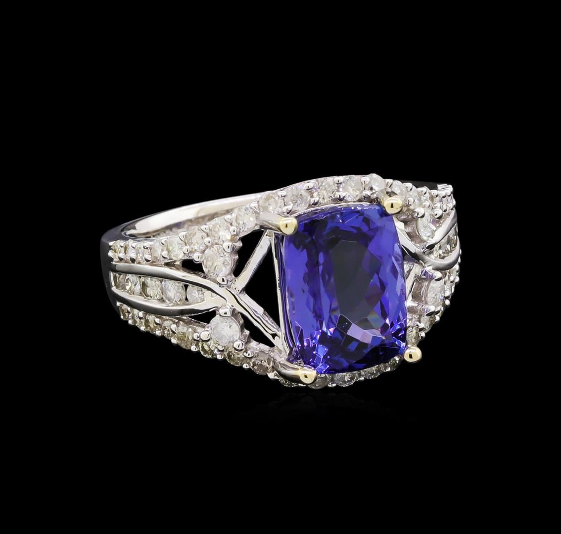 One electronically tested 14KT white gold ladies combination cast & assembled tanzanite and diamond ring with a split shank with a bright polish finish. Identified with markings of "14K". Condition is new. Containing: One prong set rectangular cushion modified brilliant cut natural tanzanite, measuring 9.78 x 7.24 x 4.53mm, approximate weight of 2.53ct., clarity is eye clean, type I, medium, very slightly grayish, violet color, (GIA V 5/3), cut is good. Sixty prong set round brilliant cut diamonds, measuring 1.80 - 1.40 x 0.96mm (depth est.) approximate total weight of 60 Stones = 0.89ct. Clarity: I-1 to I-3. Color: I - J, Cut is Good. Colored gemstones are presumed to have been subjected to commonly used enhancement processes. All diamonds and colored gemstones are graded in the mounting, unless otherwise stated. Total Weight of Colored Stones 2.53ct. Total Weight of Diamonds 0.89ct. Total Weight of Ring 4.80 grams. GGL Appraised.