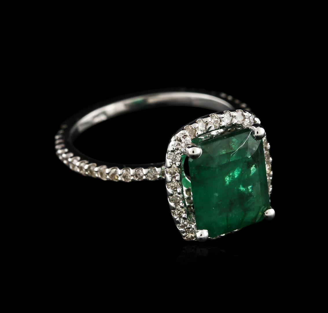 One electronically tested 14KT white gold ladies cast emerald and diamond ring with a bright polish finish. Identified with markings of "14K". Condition is new. Containing: One prong set emerald standard step cut natural emerald, measuring 9.71 x 8.05 x 4.40mm, approximate weight of 2.53ct., clarity is heavily included, type III, medium, very slightly grayish, green color, (GIA G 5/3), cut is good. Fifty-Six prong set round brilliant cut diamonds, measuring 1.30 - 1.30 x 0.78mm (depth est.) approximate total weight of 56 Stones = 0.45ct. Clarity: I-1 to I-2. Color: J - K, Cut is Good. All diamonds and colored gemstones are graded in the mounting, unless otherwise stated. Colored gemstones are presumed to have been subjected to commonly used enhancement processes. Total Weight of Colored Stones 2.53ct. Total Weight of Diamonds 0.45ct. Total Weight of Ring 3.06 grams. GGL Appraised at $2,160.00.