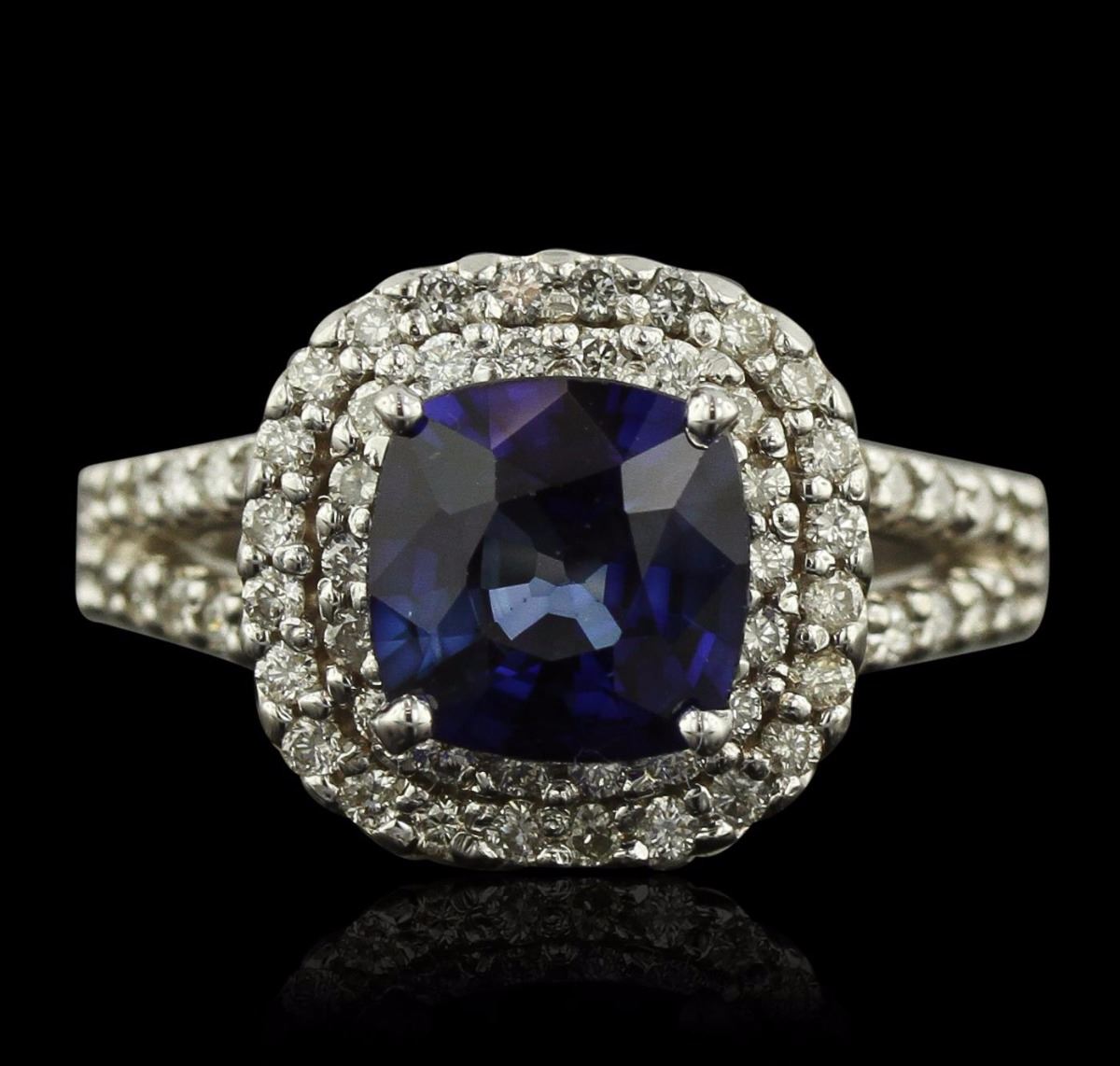 One electronically tested 14KT white gold Ladies combination cast & assembled ring with a high polish finish. Condition is new. Identified with markings of "585". Containing: One prong set square cushion modified mixed cut natural tanzanite, measuring 8.00 x 8.00 x 4.60mm, approximate weight of 2.53ct., clarity is eye clean, type I, medium dark, moderately strong, blue color, (GIA B 6/4), cut is very good. Colored gemstones are presumed to have been subjected to commonly used color/clarity enhancement processes. Seventy prong set round brilliant cut diamonds, measuring 1.30 - 1.30 x 0.86mm (depth est.) approximate. Total Weight of 70 Stones = 0.71ct. Clarity: I-1 to I-2. Color: I - J, Cut is Good. Total Weight of Colored Stones 2.53ct. Total Weight of Diamonds 0.71ct. Total Weight of Ring 5.80 grams. GGL Appraised at $5,995.00.